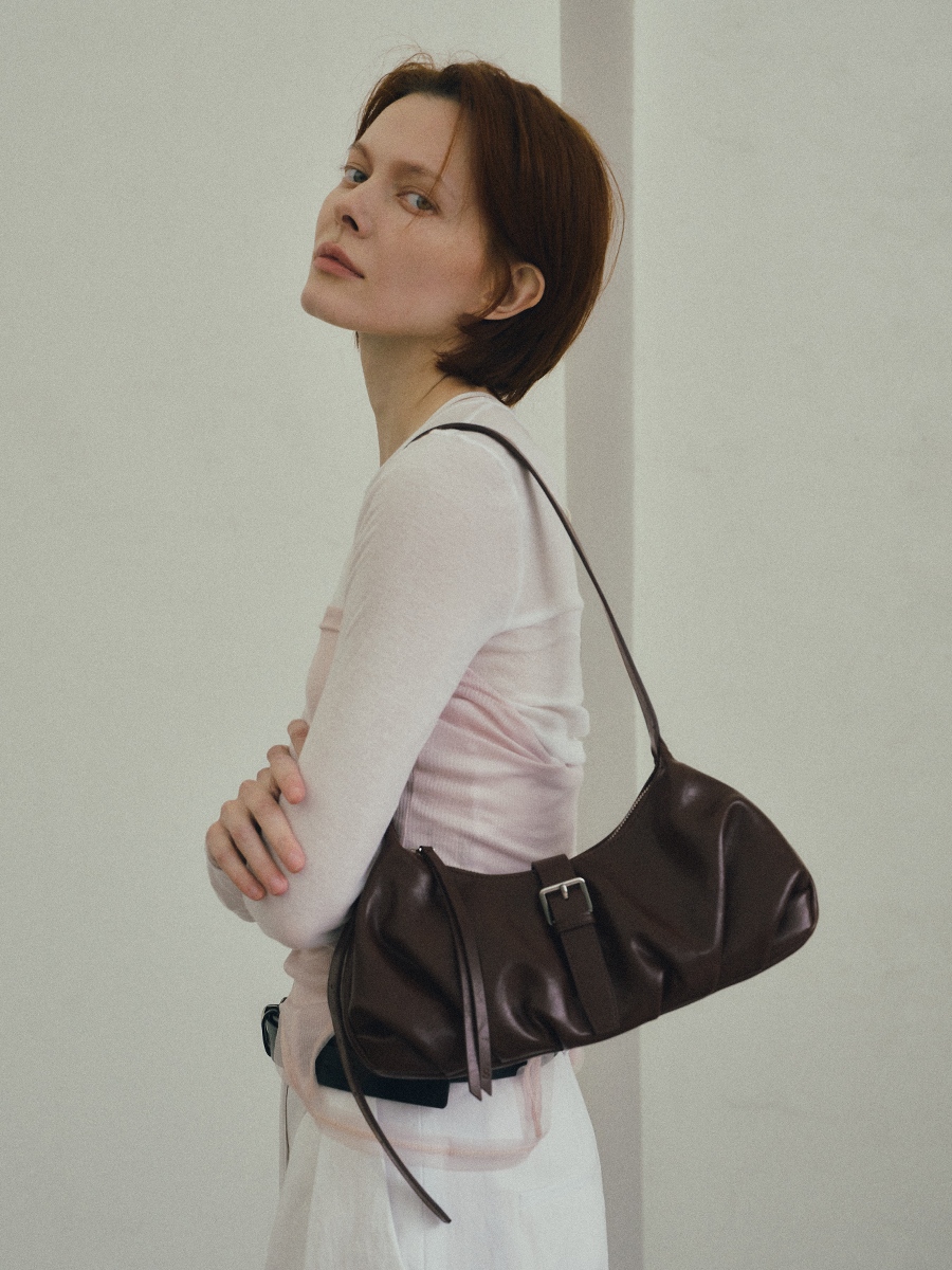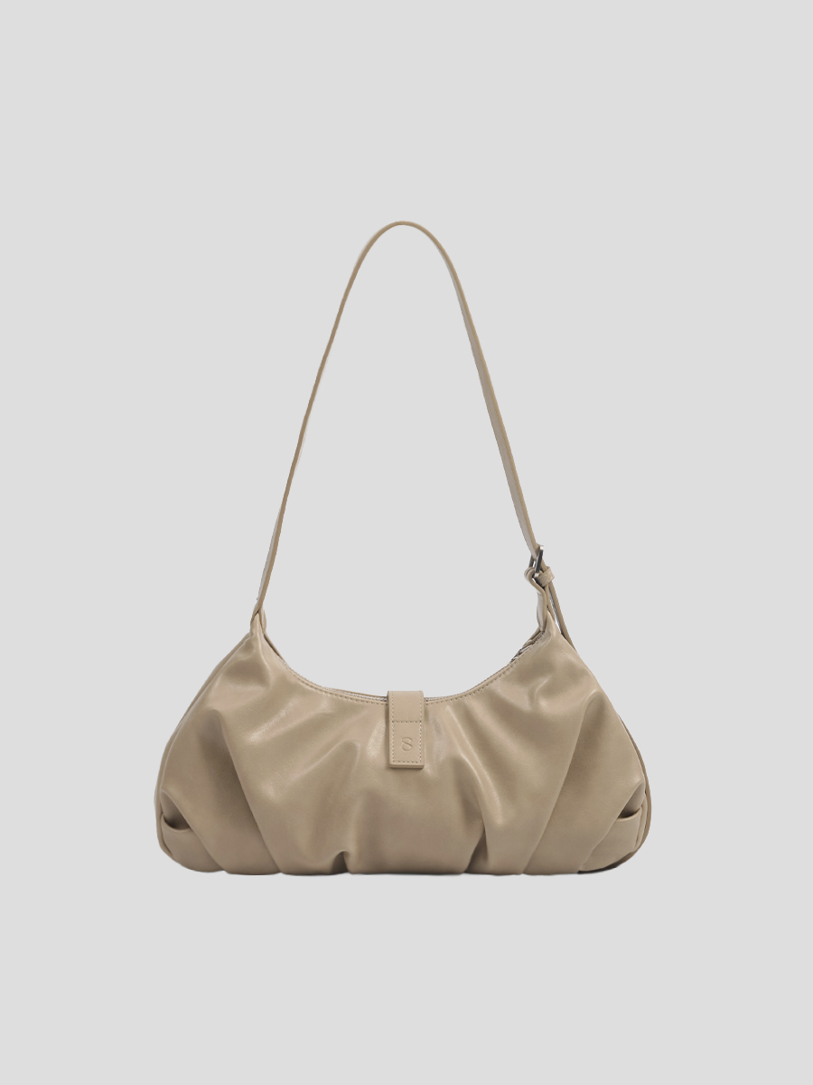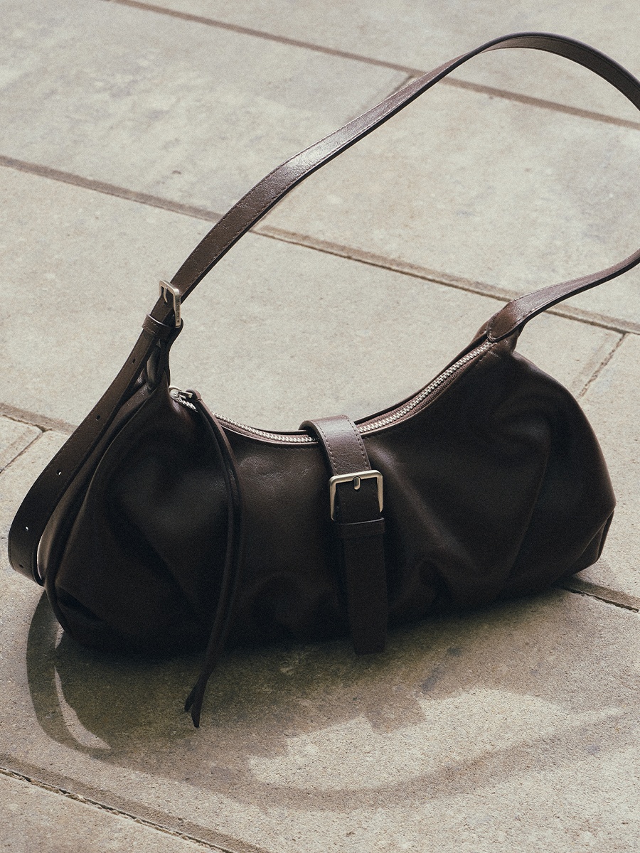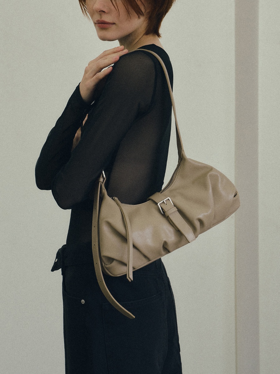Flora 針扣抓皺肩揹包 以簡約質感為設計核心,包身採用手感柔韌的 PU 皮革,呈現俐落造型的同時,保有柔和線條的細膩感。包身下緣的自然褶皺設計,增添輕盈的輪廓感,與中間五金針扣形成對比,展現精緻質感。可調節揹帶搭配品牌訂製掃叻色針扣,靈活應對不同穿搭需求。內裏設有貼式口袋與拉鍊暗袋,可有序收納手機、錢包等隨身物件,滿足日常使用需求。整體輪廓簡約而不單調,細節講究而實用,兼具俐落外型與日常功能,是兼顧質感與實用性的肩揹包款。