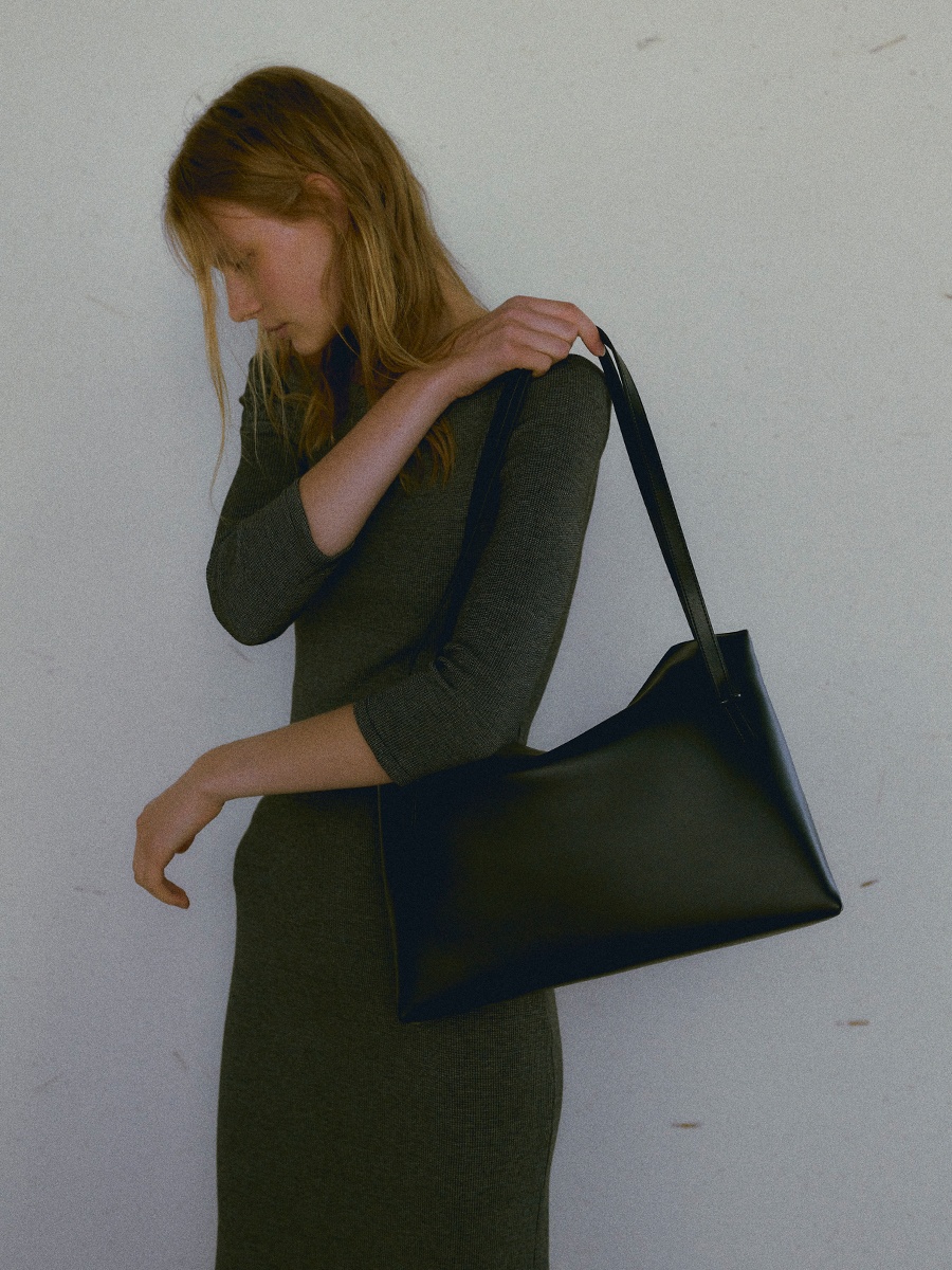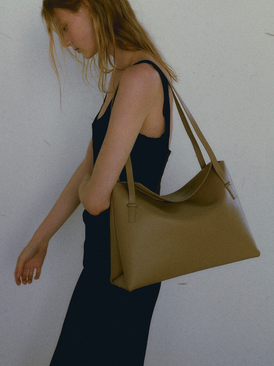 此款 Flip 真皮翻蓋軟方包 Large 採用牛皮製作,廓形以極簡為基底概念,兩側啞面圓潤,將局部收摺立體化,整體設計低調出眾而不失層次。