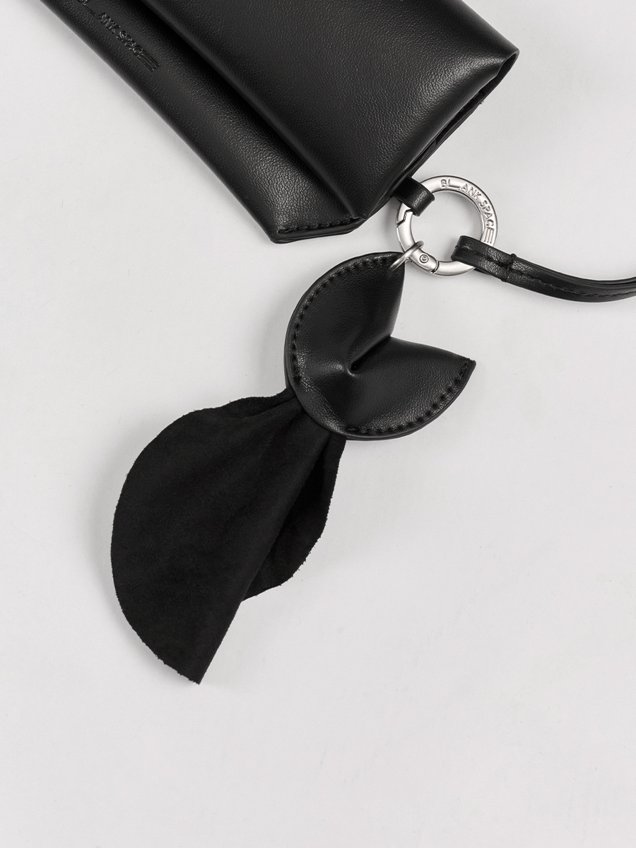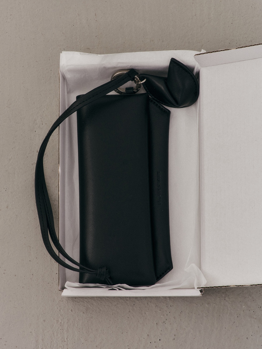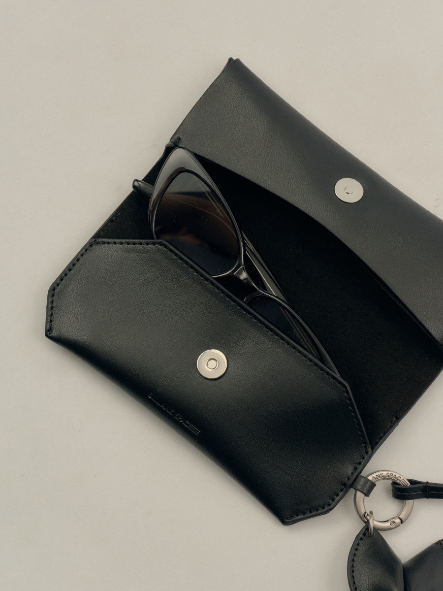 Etta墨鏡收納包 以簡約俐落的長方形結構為基礎,透過自然摺線塑造柔和立體感。包身選用觸感細膩的霧面超纖皮革,展現輕盈柔韌的質感。磁扣開闔設計提升使用便利性,內層空間可穩固收納墨鏡或小物;背面夾層則可有序收納卡片與鈔票,體積輕巧卻滿足日常所需,讓攜帶更靈活。正面以品牌 LOGO 低調壓印,延續整體簡約俐落的風格。可拆式掛繩搭配品牌訂製掃叻色五金環,結合「幸運餅乾」造型掛件,內藏柔軟眼鏡擦拭布,於細節間融入巧思與實用性。皮繩亦可纏繞於包身揹帶,靈活轉化為造型掛飾,為日常搭配增添一抹變化與趣味。