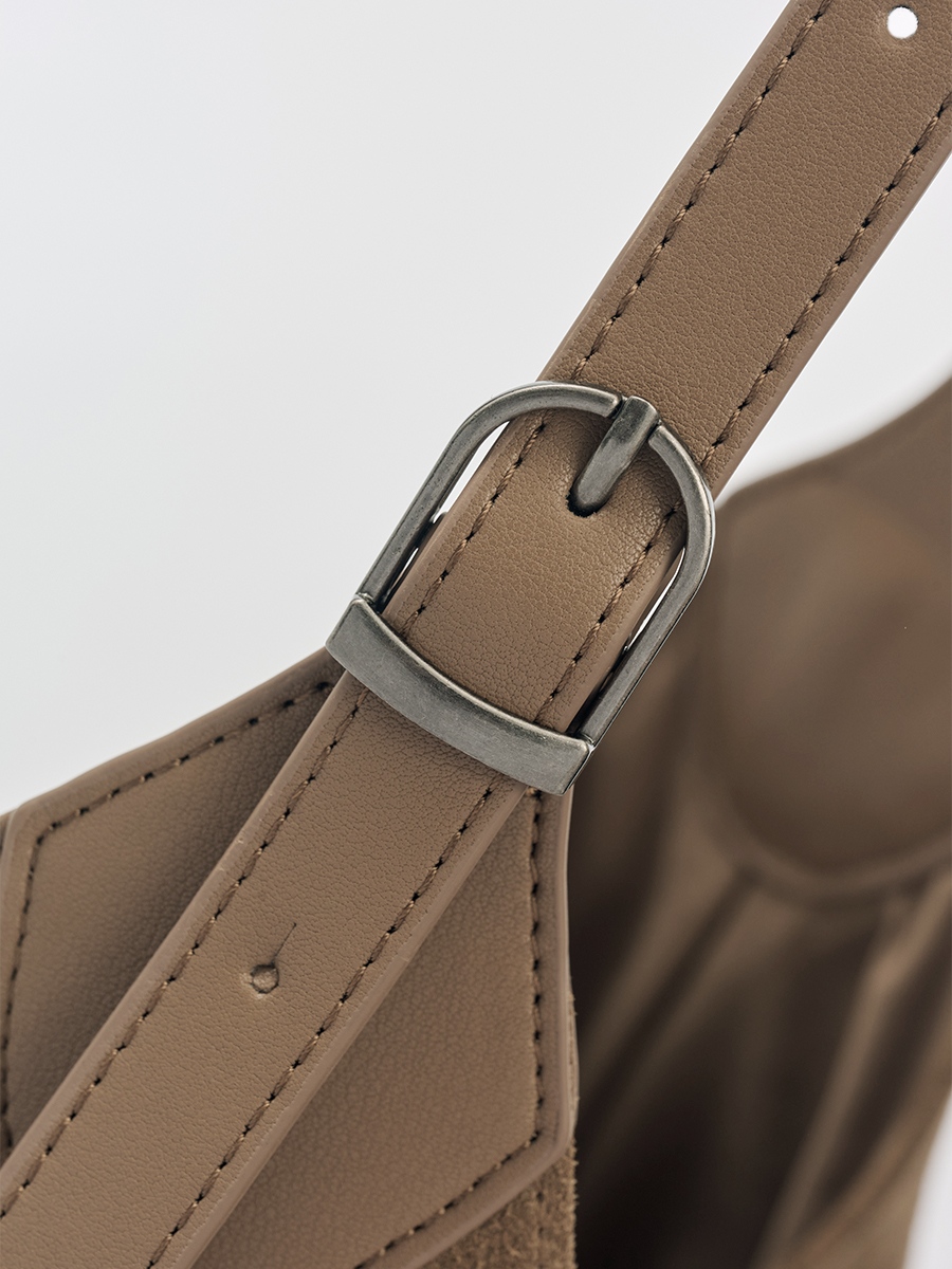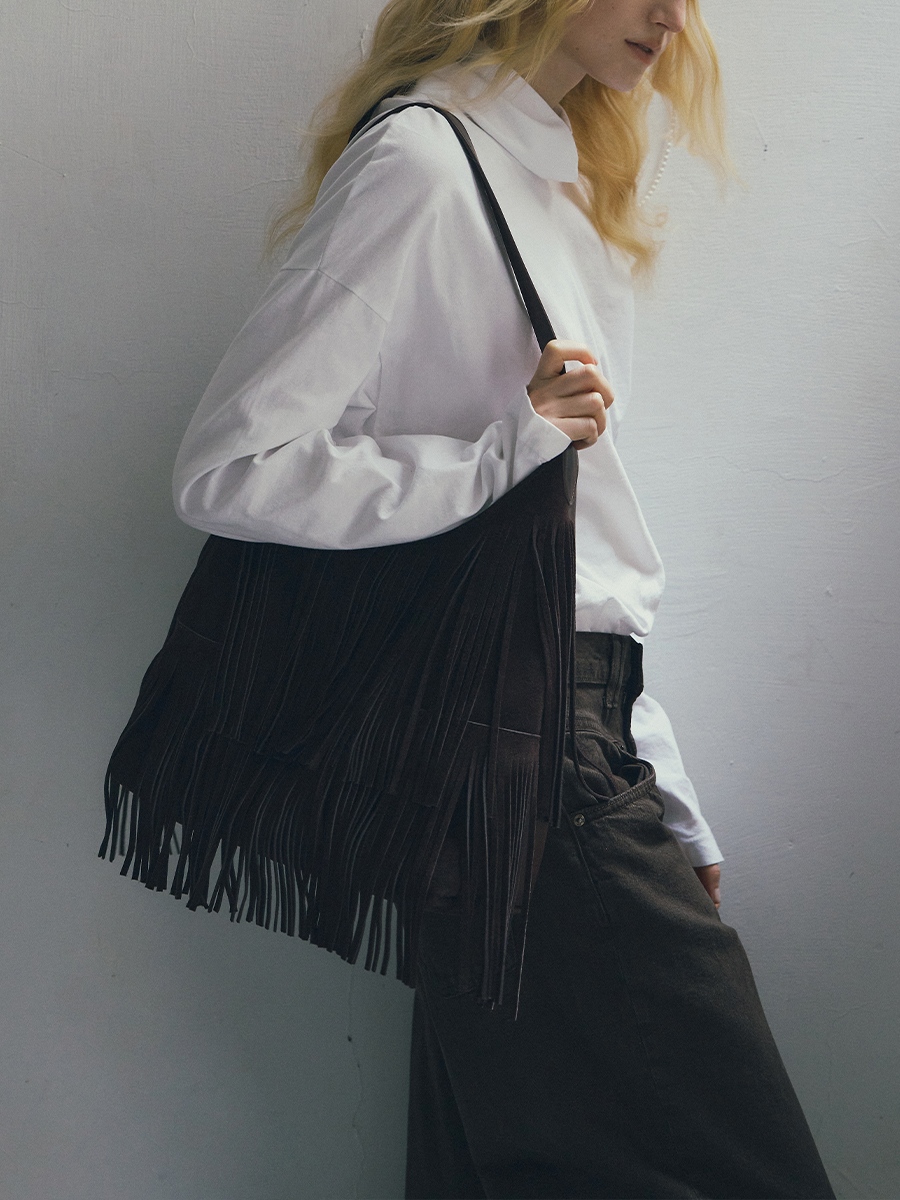 Sue 真皮流蘇托特包 以簡潔大廓形為基礎,勾勒俐落結構線條,結合雙材質雙面設計,一包即可呈現兩種風格,靈活切換,滿足多樣化的日常需求。正面選用磨砂麂皮,搭配大面積流蘇細節,隨步伐搖曳,增添層次與律動感。反面則以手感柔韌細膩的超纖皮革呈現俐落大方的輪廓,無論正式場合或休閒穿搭都能輕鬆駕馭。揹帶採用寬至窄的漸變線條設計,展現俐落感並提升高級氛圍;大容量空間兼具舒適與實用性。