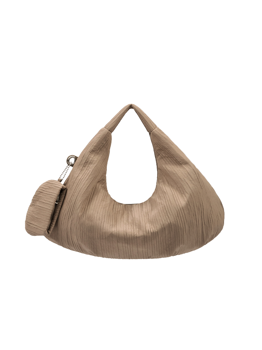 Abby抓皺直紋兩用包 以輕盈蓬潤為設計核心,透過弧形輪廓與抓摺工藝,形塑出柔軟卻不失結構感的包身線條。包身選用霧感風衣布料,質地輕盈滑順,表面細緻均勻的壓褶紋理隨著行走與動作自然流動,為整體注入輕快的律動感。隨包附拉鍊小包掛件,提供即時收納的便利性,同時為造型增添層次變化;小包亦可獨立使用,延伸單一包款的多元搭配可能。包內規劃多個分類夾層,可有序收納手機、錢包等日常隨身物件,兼顧整潔與靈活運用。細節部分選用品牌訂製的掃叻色五金,與柔軟布料形成細膩的材質對比,小包以精緻刺繡工藝呈現品牌 Logo,低調點綴整體質感。整體以輕盈布料結合圓潤輪廓,搭配可調節揹帶設計,可依需求轉換為手提、肩揹或斜挎,靈活因應不同穿搭與生活場景,於實用性與風格之間取得平衡,適合城市通勤與日常出行,展現自在、隨性且富有生活感的設計氛圍。