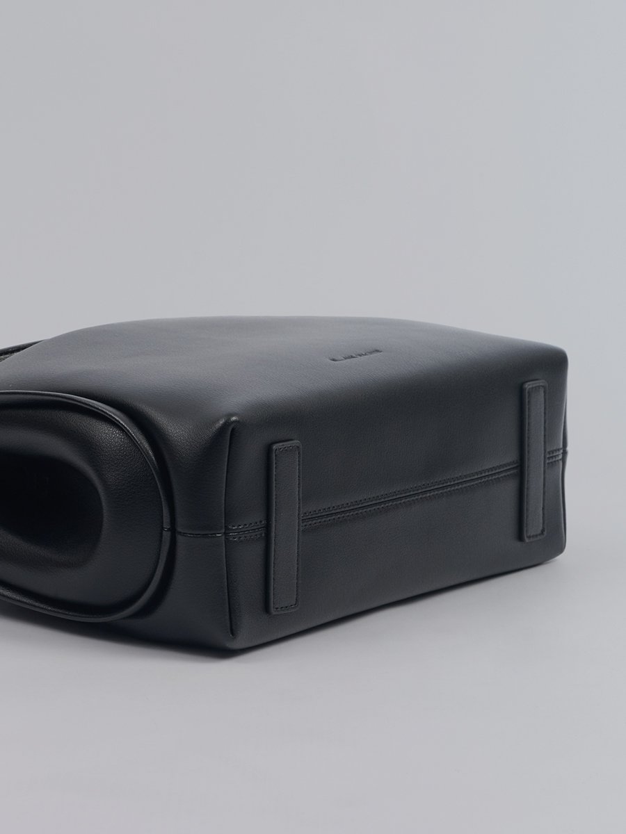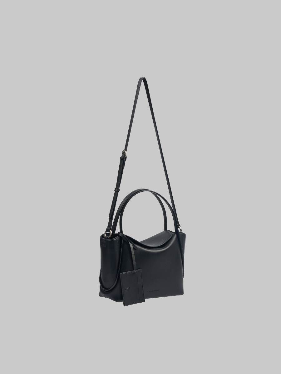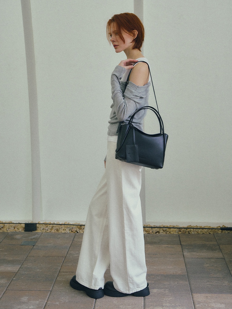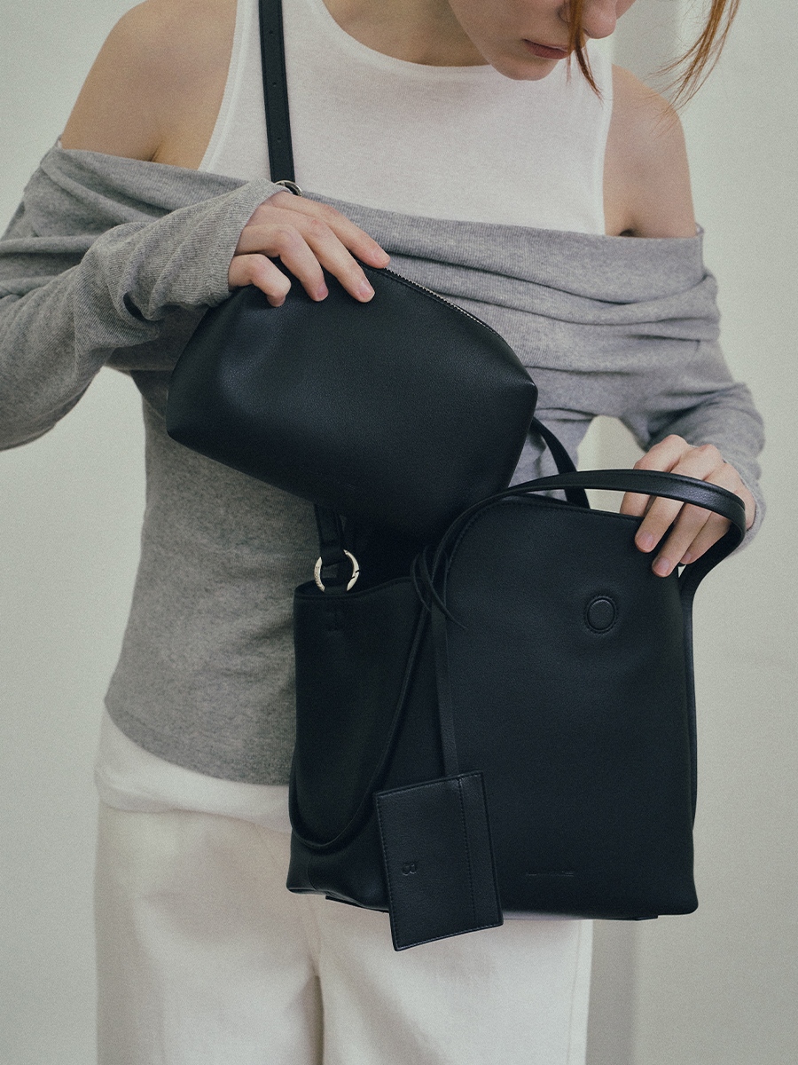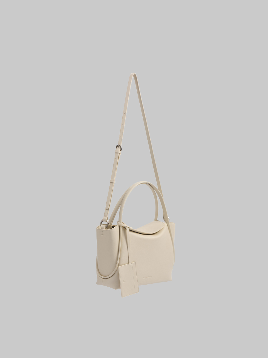 隨包附卡夾掛件,提供即時收納的便利性,同時為造型增添層次;內部另配置拉鍊小包,加強物品的安全性與分類機能。卡夾與拉鍊小包皆可獨立使用,使單一包款延伸出更多元的使用方式,體現多用性設計。在極簡外型下蘊含可變結構與細緻機能,此款包除手提外,另附可調節長揹帶,可依需求轉換為手提、肩背或斜挎,