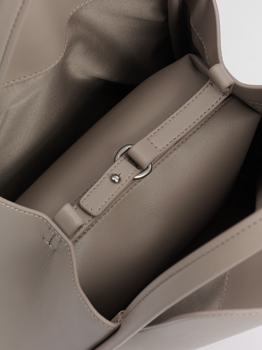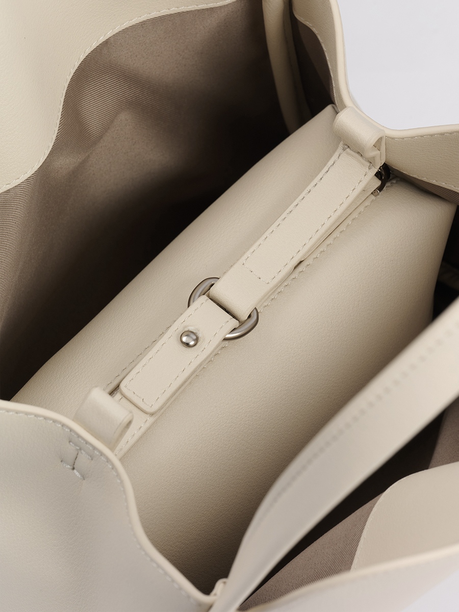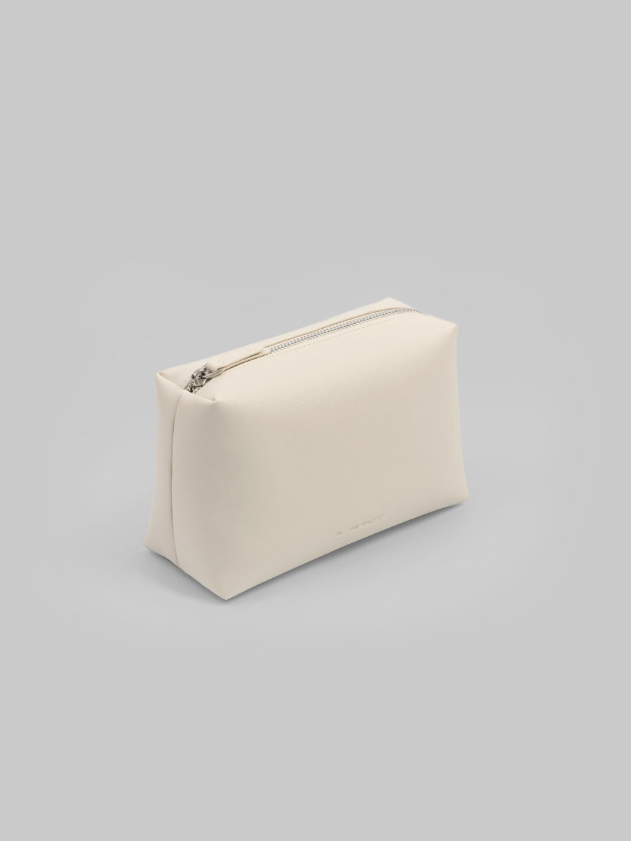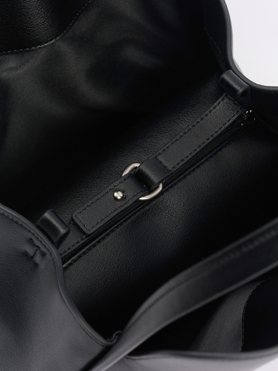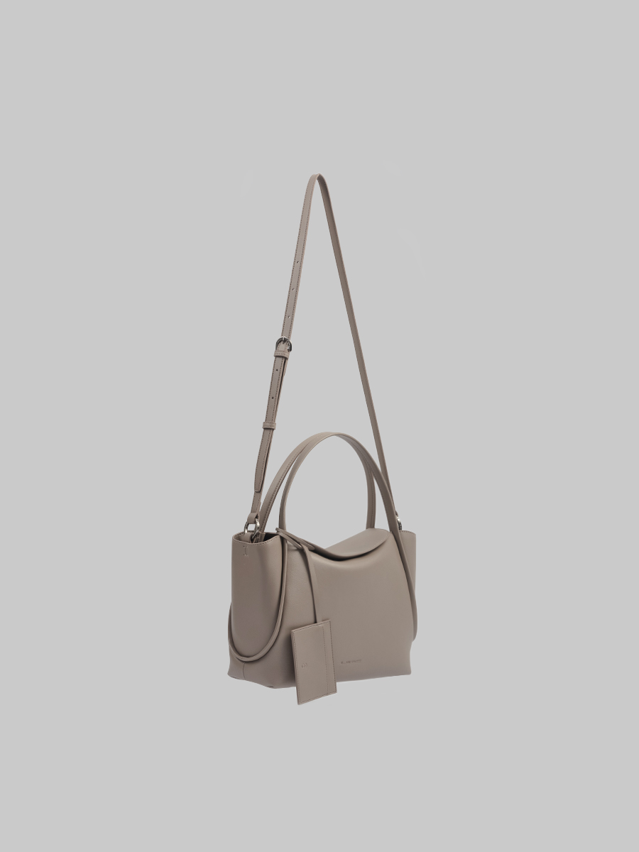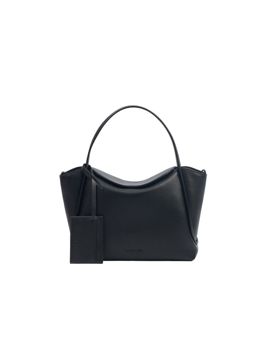 隨包附卡夾掛件,提供即時收納的便利性,同時為造型增添層次;內部另配置拉鍊小包,加強物品的安全性與分類機能。卡夾與拉鍊小包皆可獨立使用,使單一包款延伸出更多元的使用方式,體現多用性設計。在極簡外型下蘊含可變結構與細緻機能,此款包除手提外,另附可調節長揹帶,可依需求轉換為手提、肩背或斜挎,