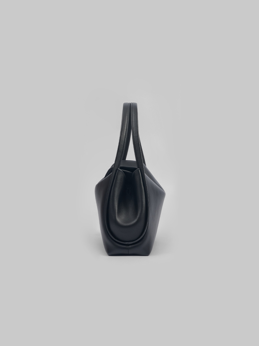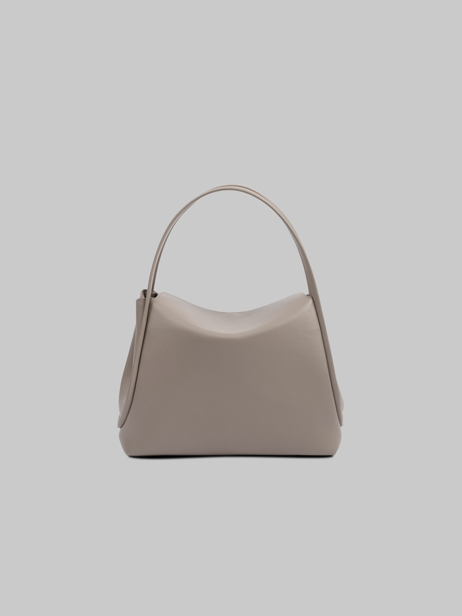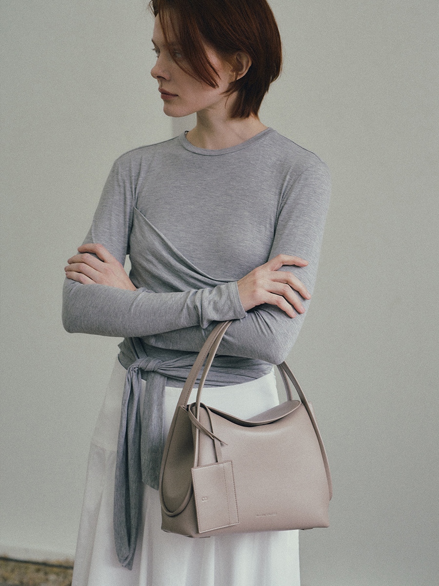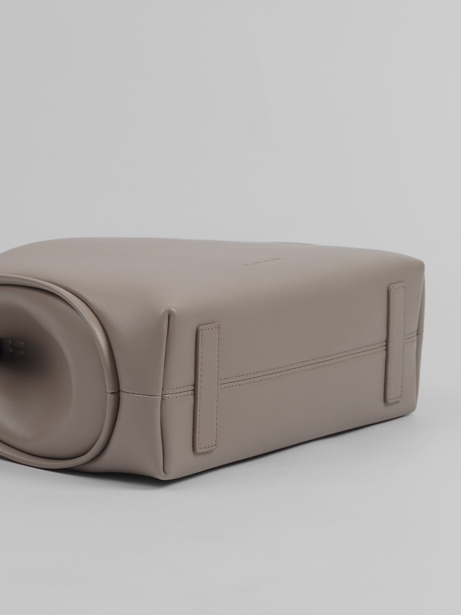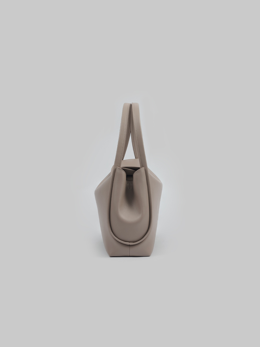 Kim 兩用手提包 以柔和弧線與結構平衡為設計核心,透過流暢的曲線剪裁,形塑出自然垂墜卻不失支撐度的輪廓,呈現簡潔內斂的質感氛圍。整體廓型具備兩種變化,透過內部的奶嘴釘結構,可將側圍向內收束,使側面形成圓潤流暢的弧形曲線,勾勒出具有立體雕塑感的線條表現;當側圍完全展開時,整體外型則回歸簡潔俐落的比例,同步提升內部收納容量,讓包款能依日常需求自由轉換外觀與機能。側邊運用立體摺線結合圓弧剪裁,提升袋型的穩定度,同時保留皮革自然蓬潤的質感;手提把以柔順曲線向上延伸,與包身輪廓相互呼應,使整體線條更為一致。