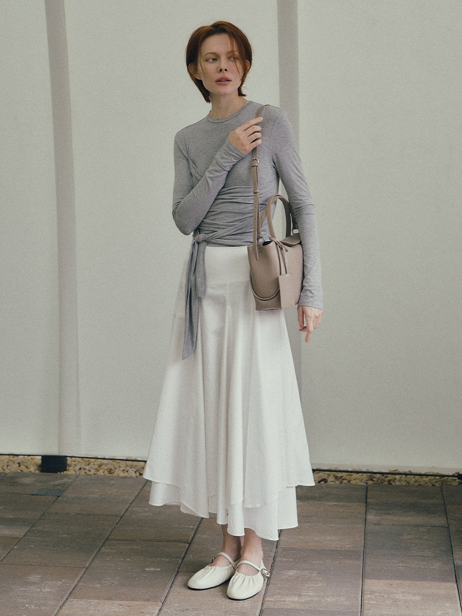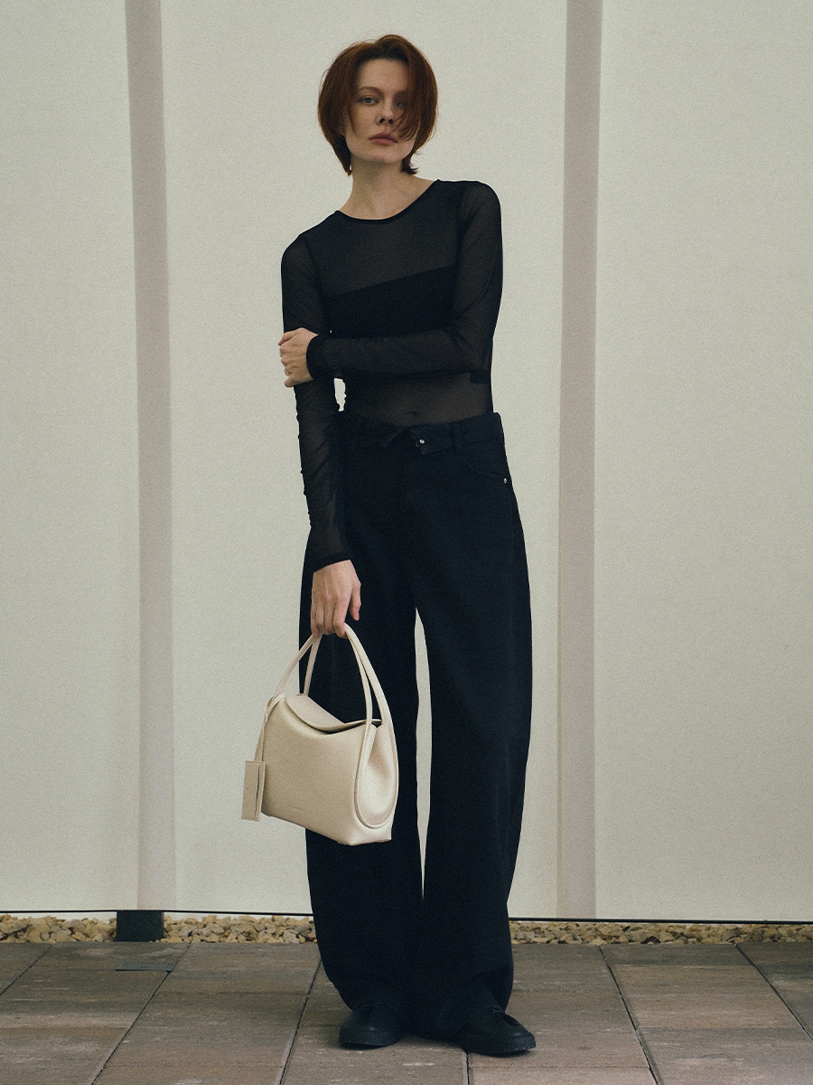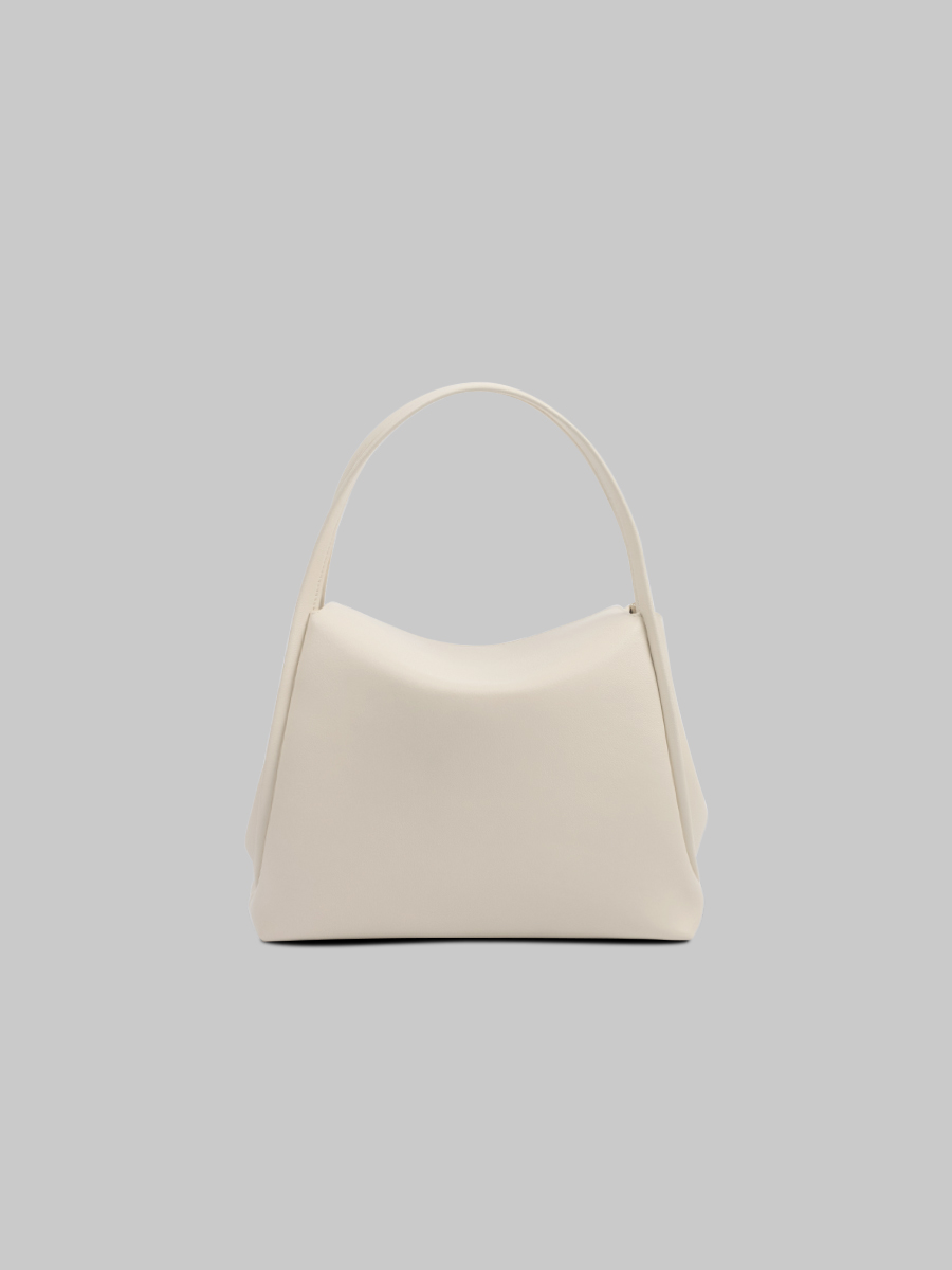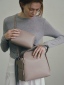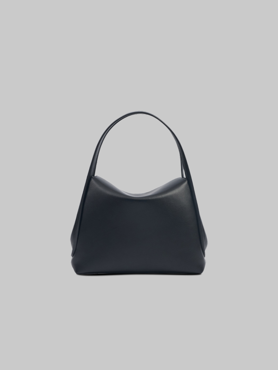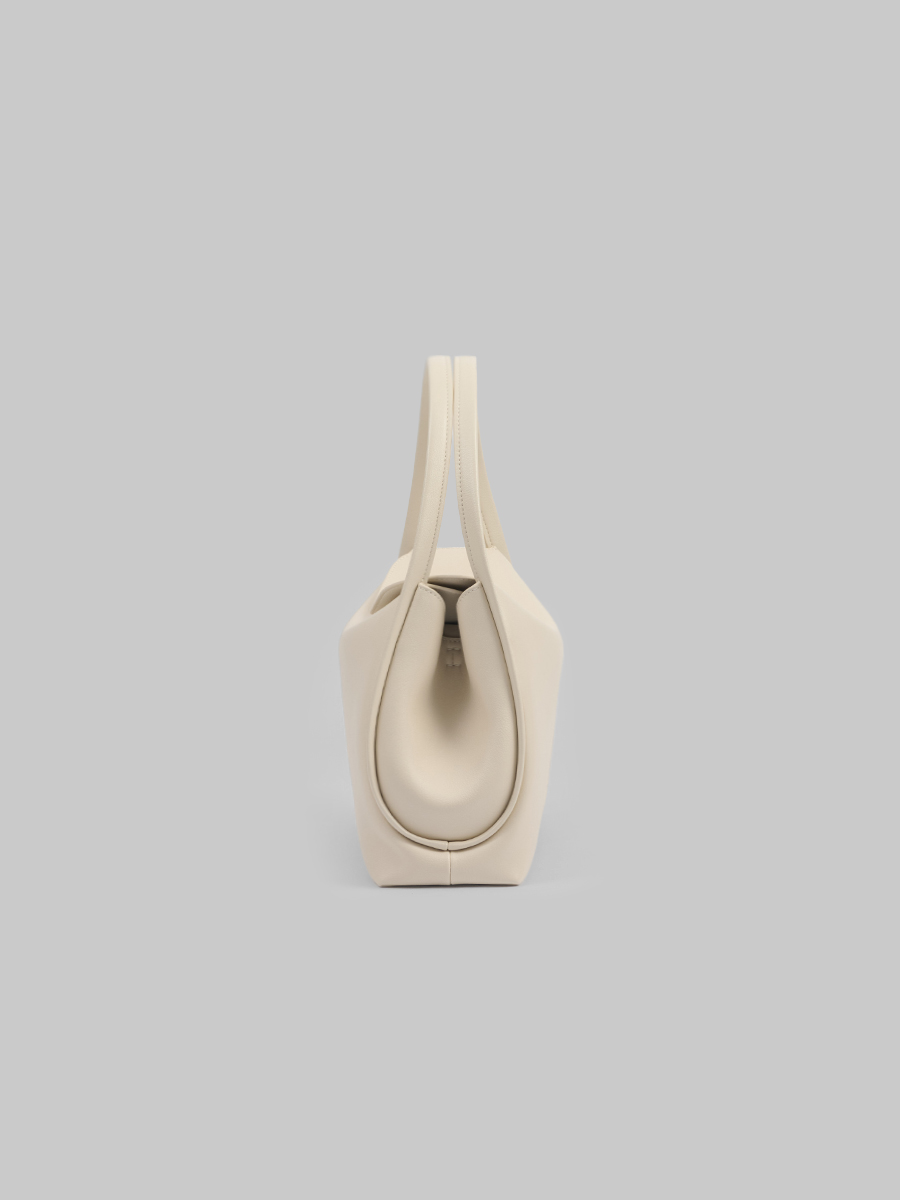 Kim 兩用手提包 以柔和弧線與結構平衡為設計核心,透過流暢的曲線剪裁,形塑出自然垂墜卻不失支撐度的輪廓,呈現簡潔內斂的質感氛圍。整體廓型具備兩種變化,透過內部的奶嘴釘結構,可將側圍向內收束,使側面形成圓潤流暢的弧形曲線,勾勒出具有立體雕塑感的線條表現;當側圍完全展開時,整體外型則回歸簡潔俐落的比例,同步提升內部收納容量,讓包款能依日常需求自由轉換外觀與機能。側邊運用立體摺線結合圓弧剪裁,提升袋型的穩定度,同時保留皮革自然蓬潤的質感;手提把以柔順曲線向上延伸,與包身輪廓相互呼應,使整體線條更為一致。