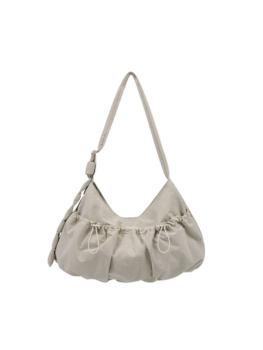 Ziva 抽繩口袋斜挎包以「輕盈機能」為核心,運用細緻抽皺工藝塑造蓬鬆弧線,在柔軟中仍保有結構感,呈現俐落線條與立體輪廓。圓潤袋型搭配立體口袋設計,提升收納實用性,同時營造俐落層次感。包身採霧感風衣布料,手感滑順且輕盈,五金使用同色系啞光烤漆,搭配訂製繡眼孔與蛋型嘴丁結構,細節設計增強耐用度與質感。背帶調節處繡有品牌標誌,內層充棉,貼合肩部並維持造型穩定,斜背或側背皆適用。內部配置多個分類夾層與隱藏式收納外袋,可有序收納手機、錢包等日常物件,兼顧整潔與靈活運用。輕盈布料與圓潤輪廓結合機能口袋與抽繩細節,使包款兼具實用性與風格,適合城市通勤或休閒出行,展現自在隨性的日常態度。