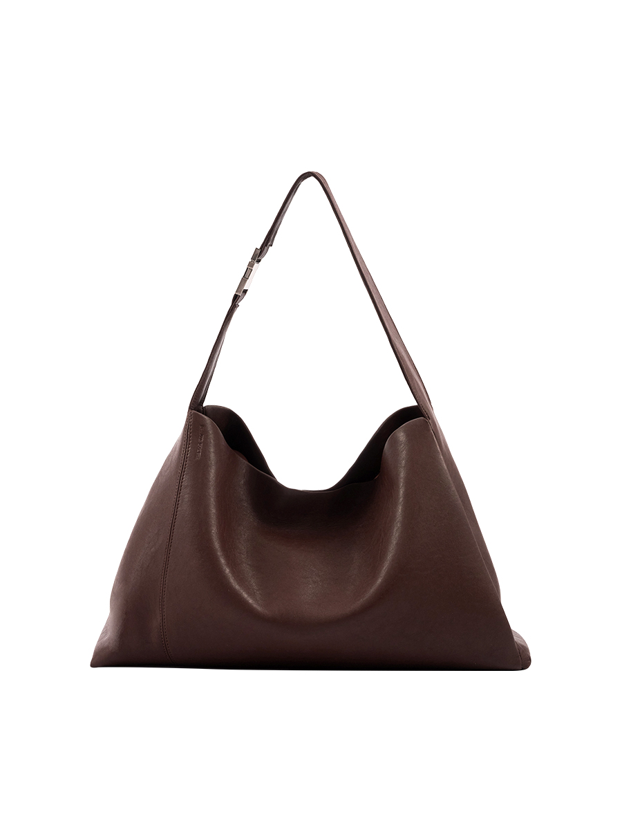 包身以柔韌皮革立體剪裁構成,線條隨重力延展,於垂墜之間映出流暢弧度;柔和外型下藏有俐落邊界,勾勒純粹的輪廓比例。