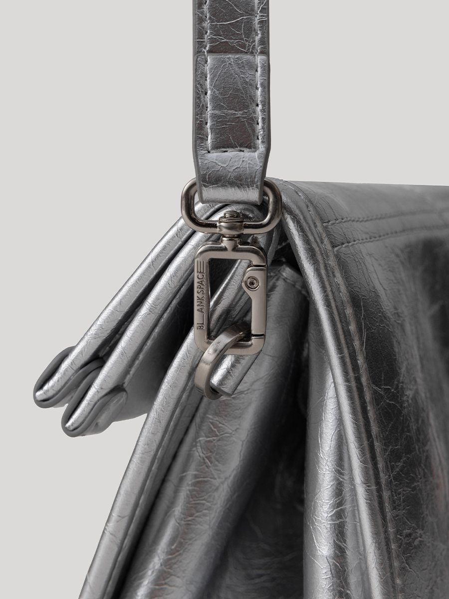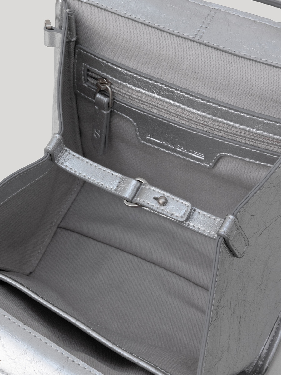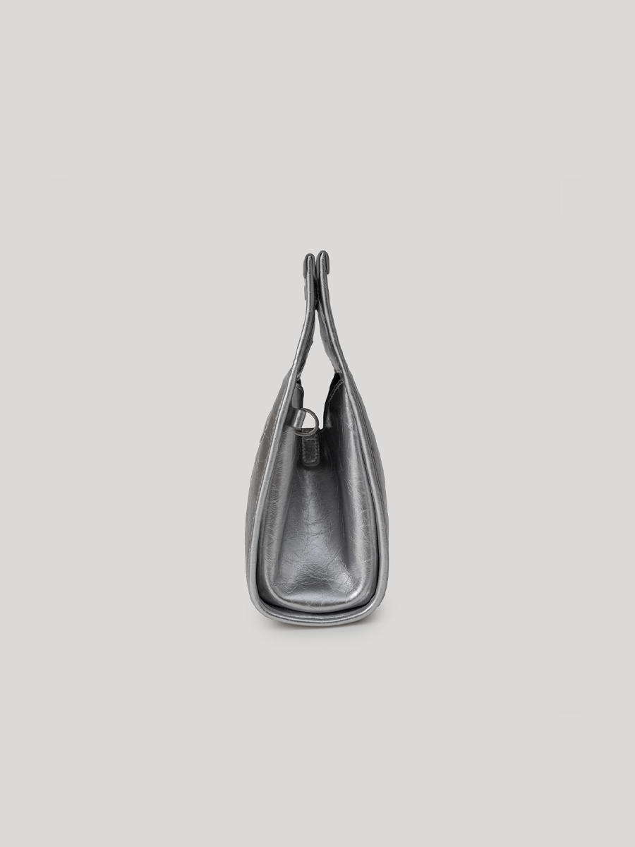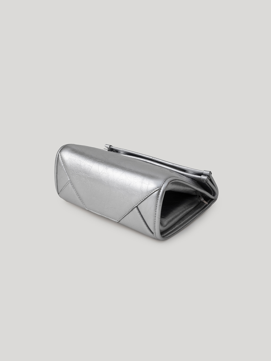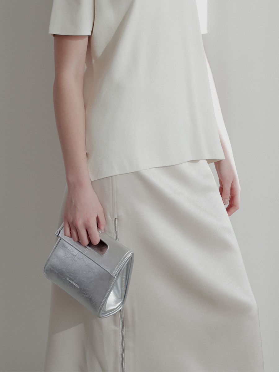 包身兩側可內摺,勾勒俐落線條,亦可展開塑造靈動造型,同時提升收納空間與實用性。皮革則採用爆裂紋皮革,以細膩的紋路復刻紙袋自然摺皺的紋理質感。底部融入紙袋摺紙工藝,不僅增添細節層次,亦提升整體結構的穩定性,兼具時尚與實用。