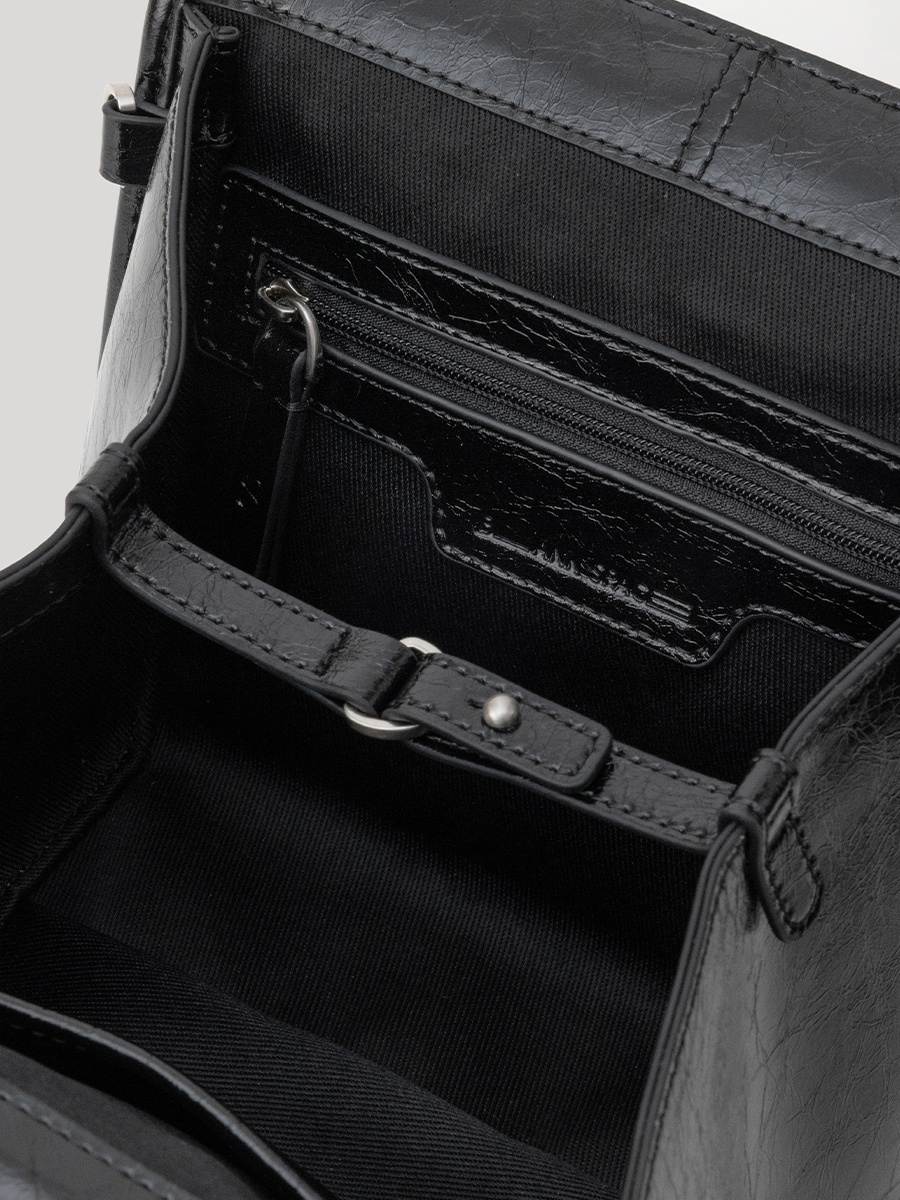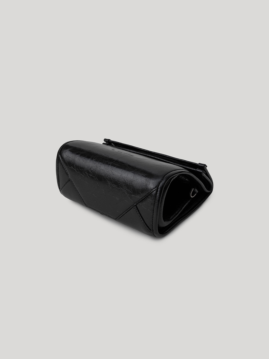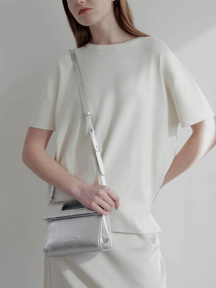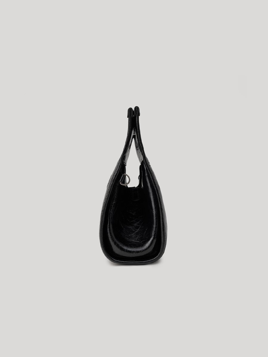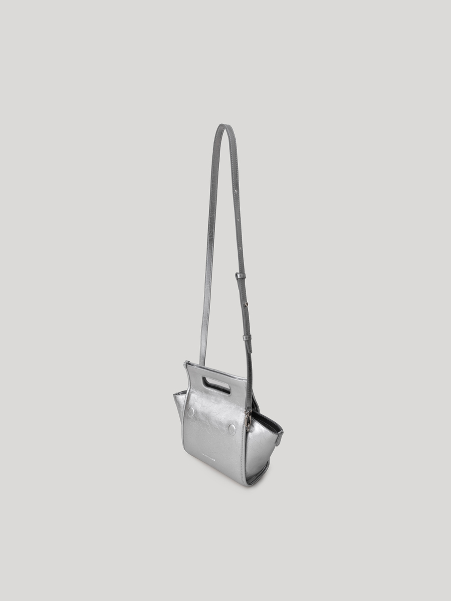 包身兩側可內摺,勾勒俐落線條,亦可展開塑造靈動造型,同時提升收納空間與實用性。皮革則採用爆裂紋皮革,以細膩的紋路復刻紙袋自然摺皺的紋理質感。底部融入紙袋摺紙工藝,不僅增添細節層次,亦提升整體結構的穩定性,兼具時尚與實用。
