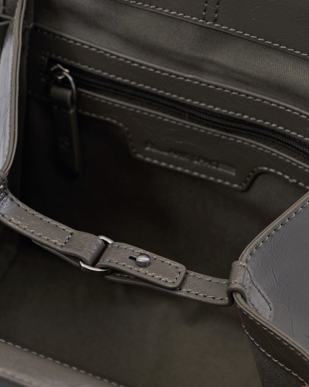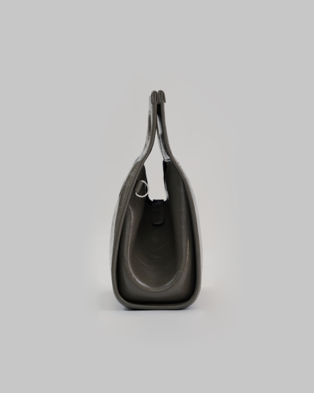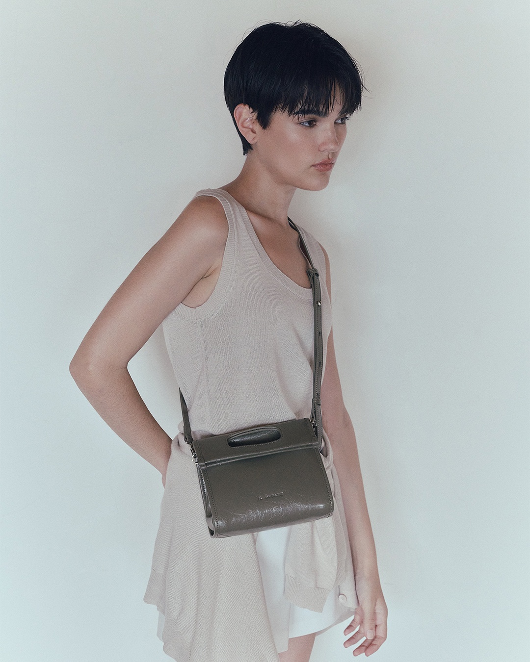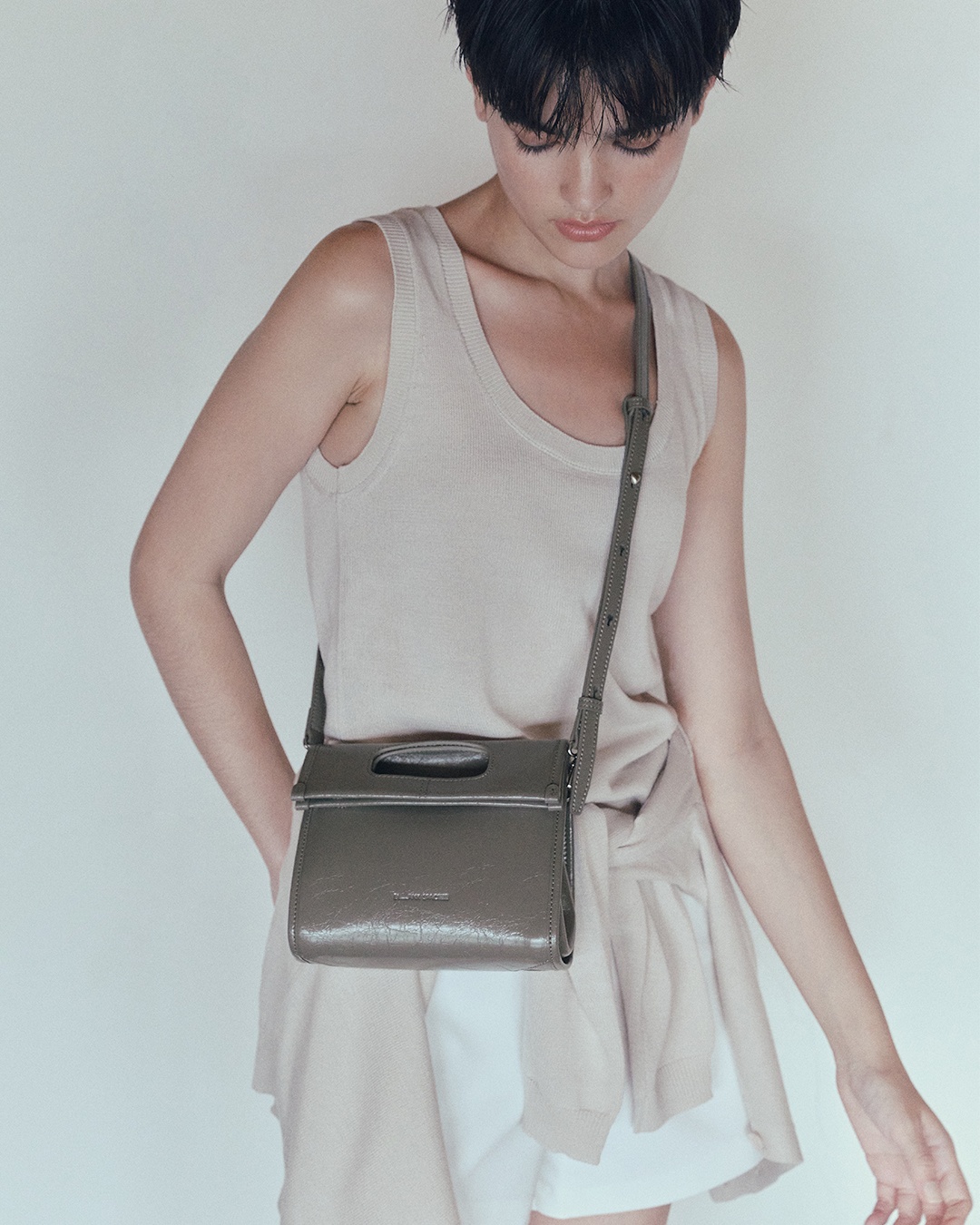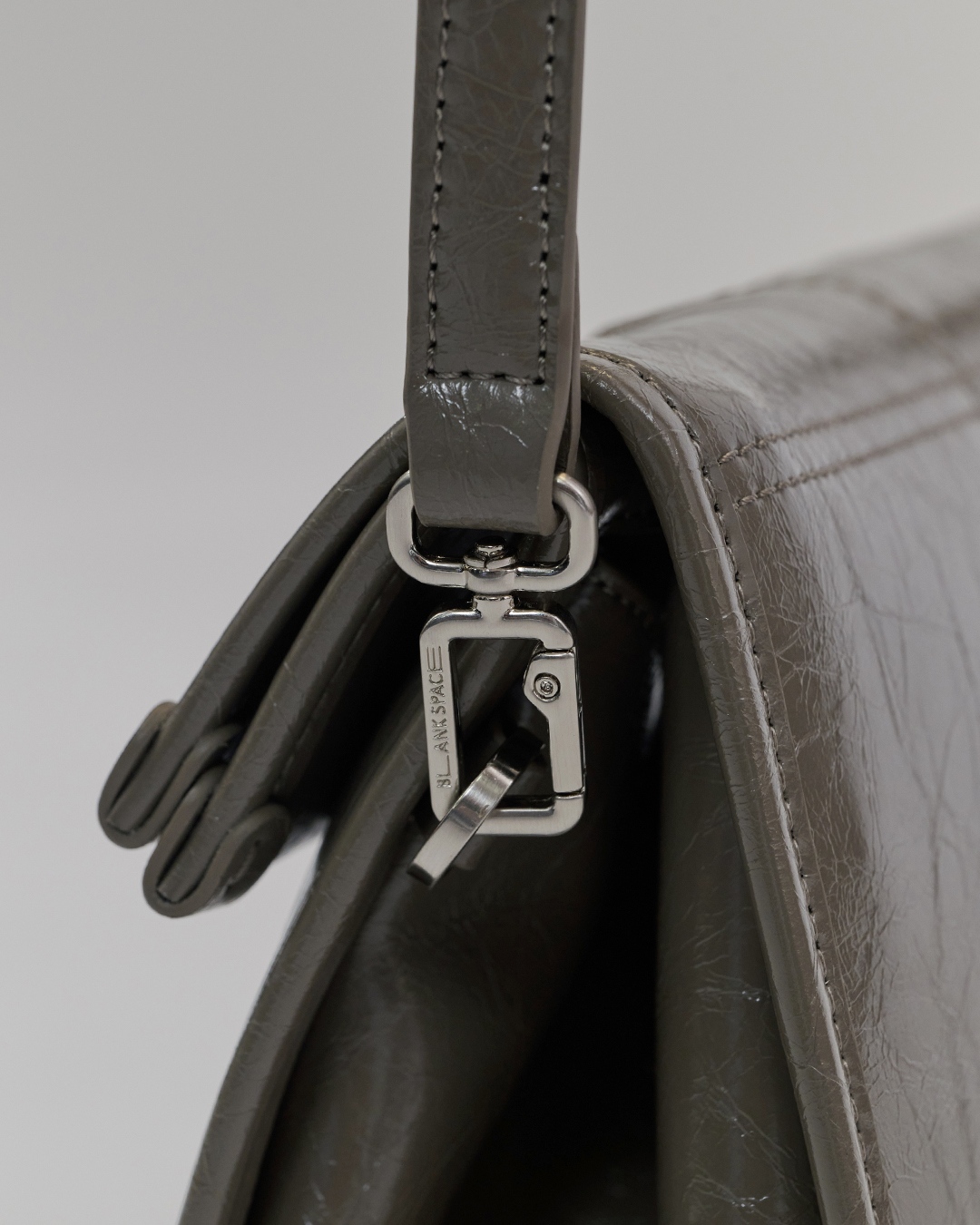包身兩側可內摺,勾勒俐落線條,亦可展開塑造靈動造型,同時提升收納空間與實用性。皮革則採用爆裂紋皮革,以細膩的紋路復刻紙袋自然摺皺的紋理質感。底部融入紙袋摺紙工藝,不僅增添細節層次,亦提升整體結構的穩定性,兼具時尚與實用。