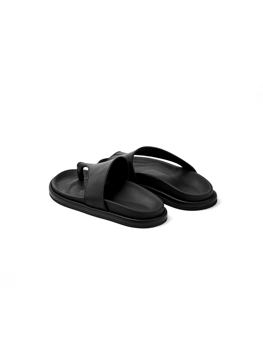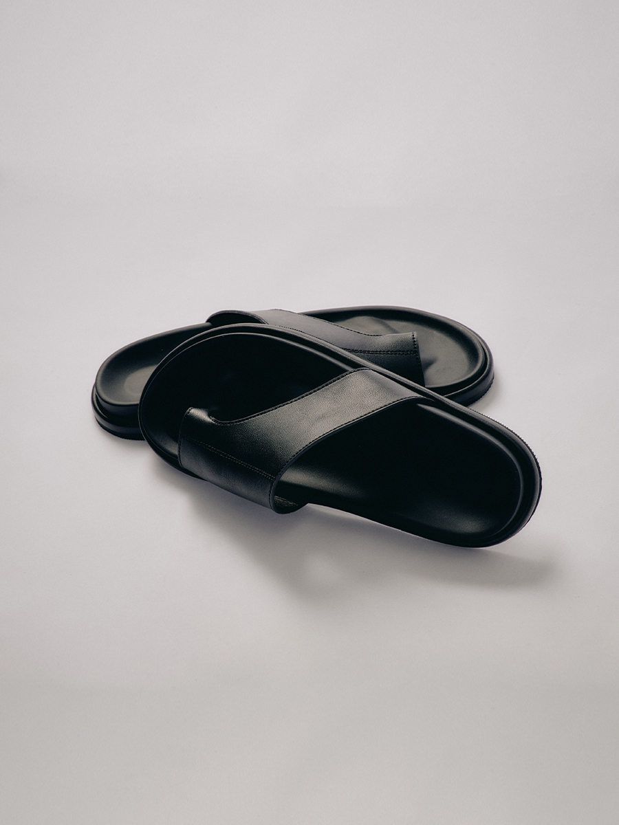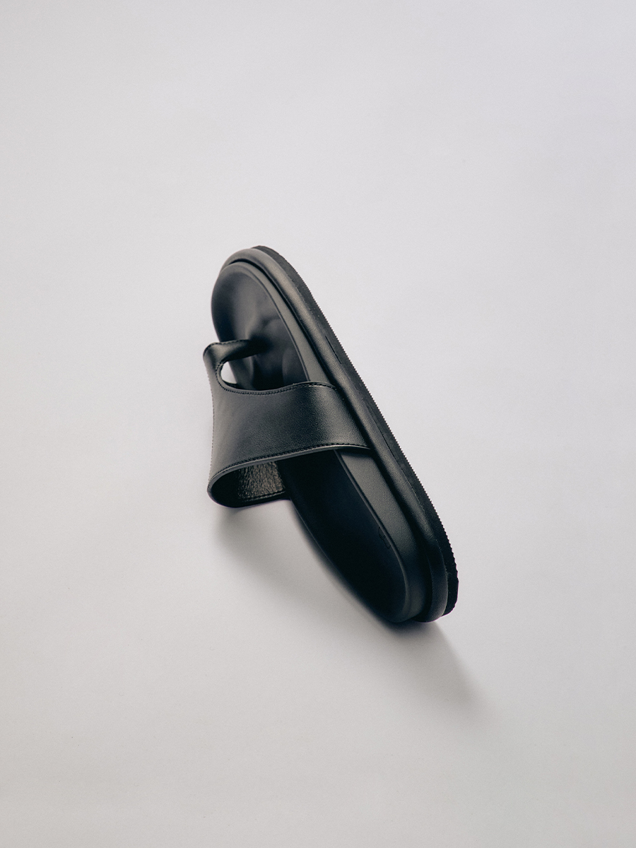 鞋面設計以單片皮革橫跨腳背的俐落極簡剪裁為核心;夾腳區特別加厚做蓬處理,提升穿著的舒適穩定。