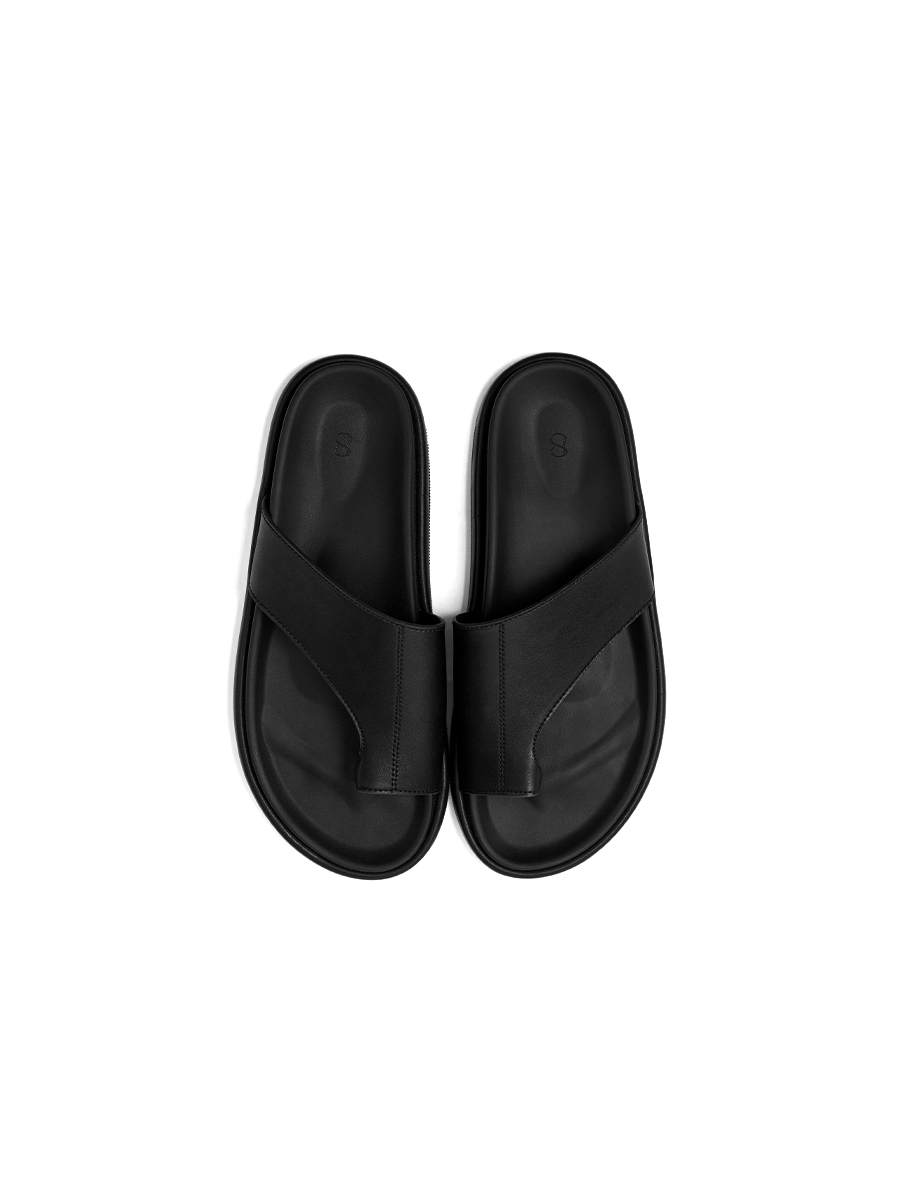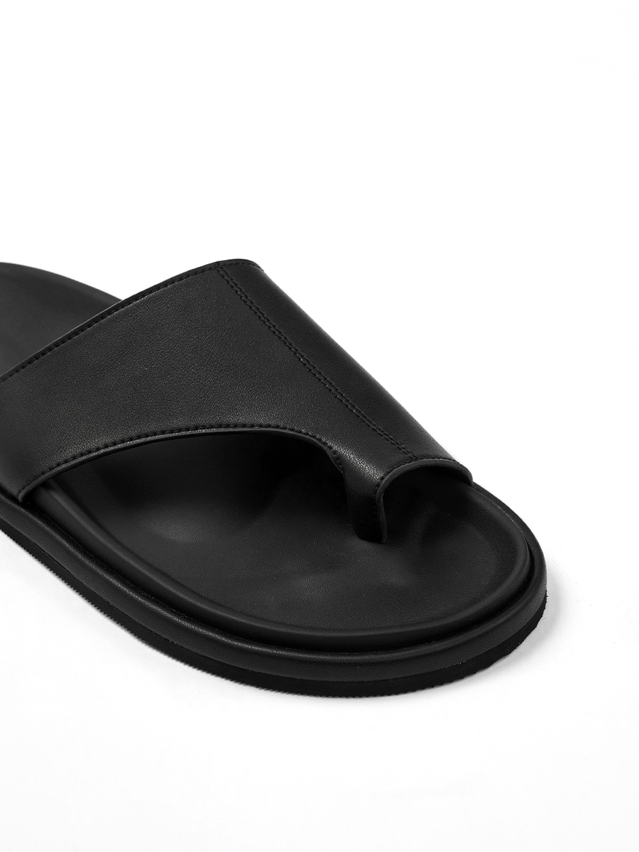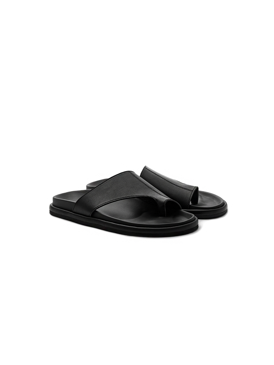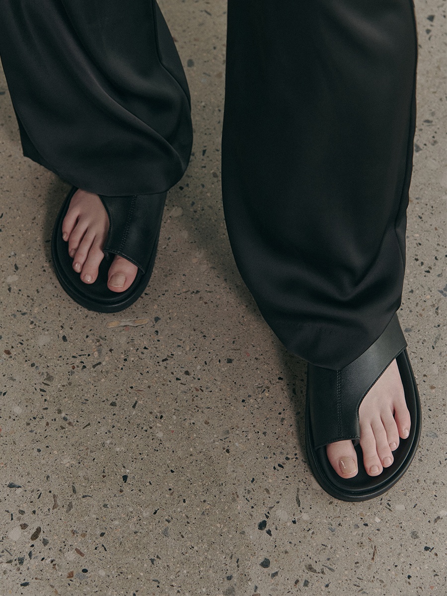 鞋面設計以單片皮革橫跨腳背的俐落極簡剪裁為核心;夾腳區特別加厚做蓬處理,提升穿著的舒適穩定。