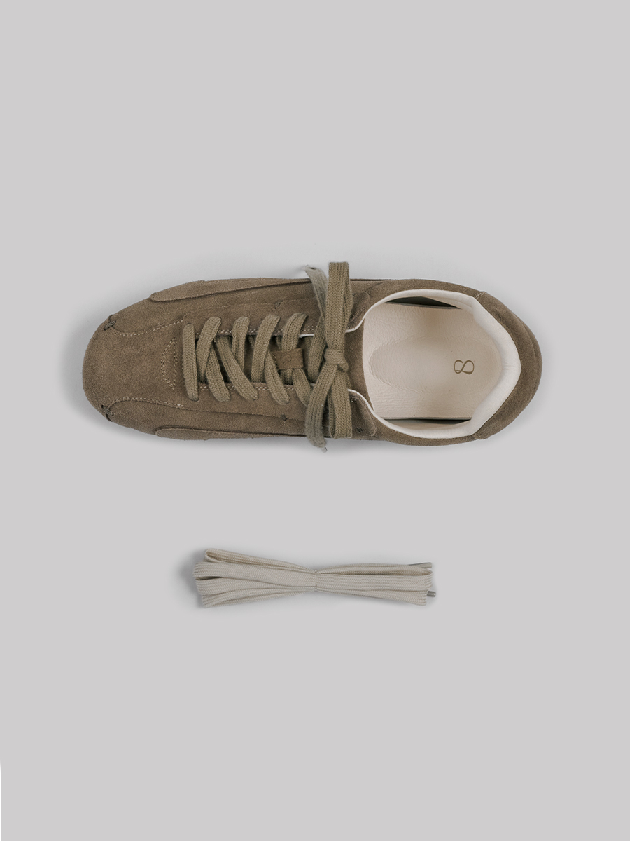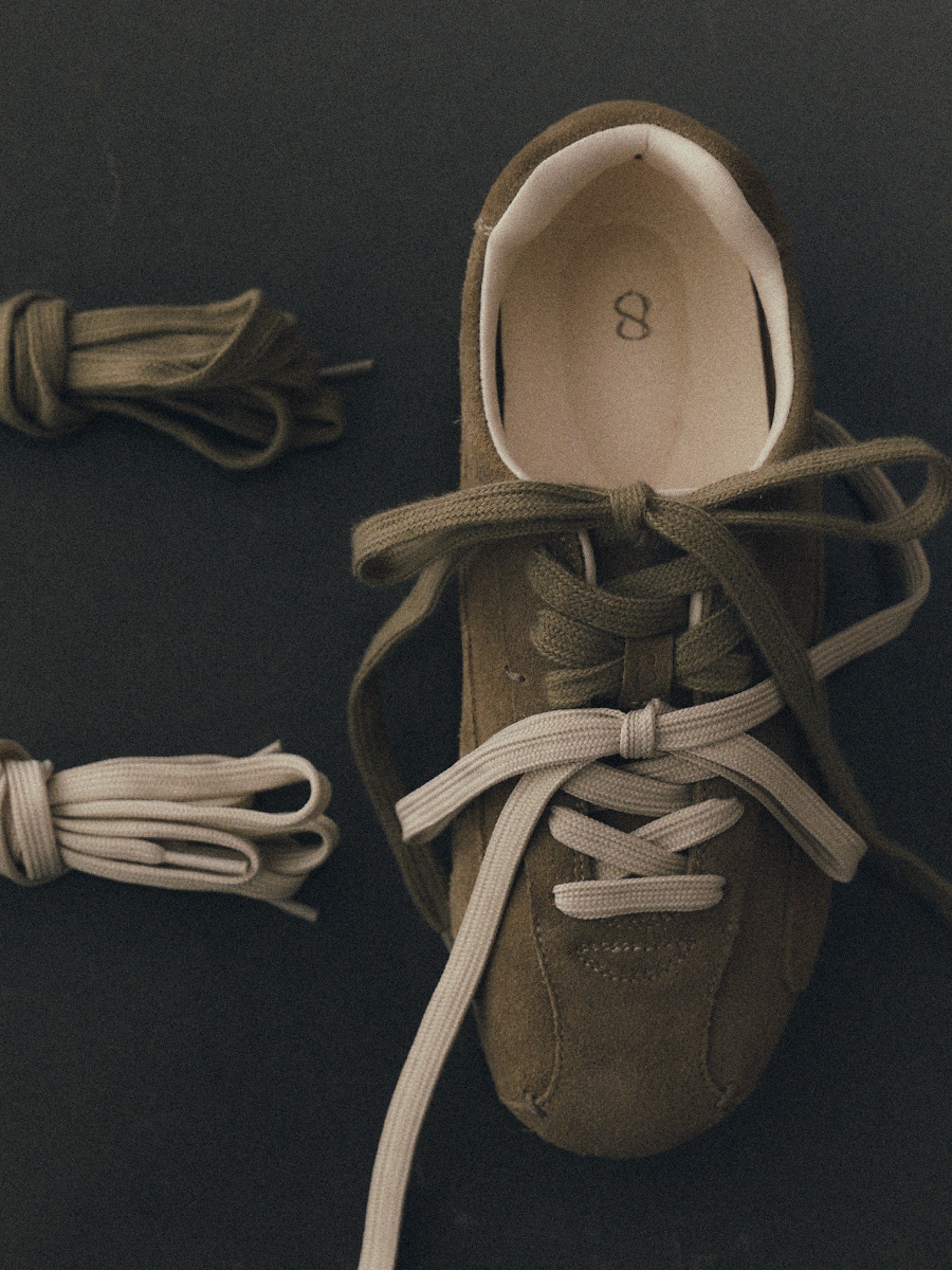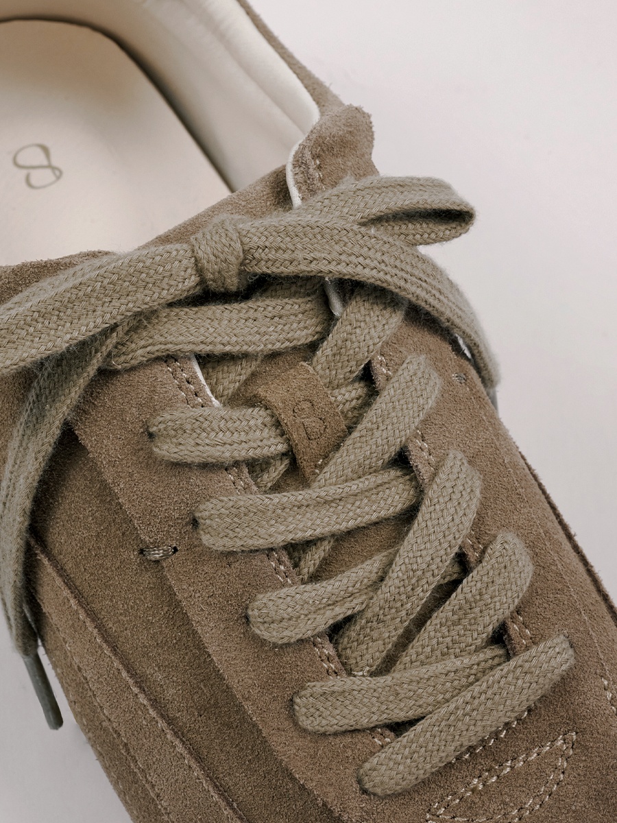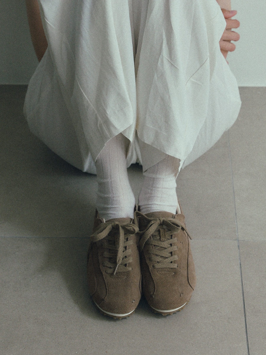 Olga 麂皮德訓鞋 設計靈感源自經典運動鞋型,鞋身搭配綁帶設計,將材質層次運用比擬為提拉米蘇的堆疊美學,兼顧視覺層次與穿著感受,演擇復古與休間並存的氛圍。