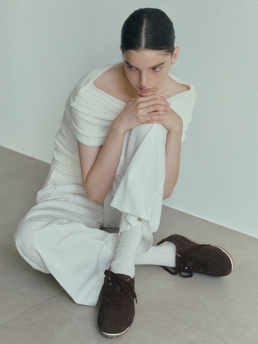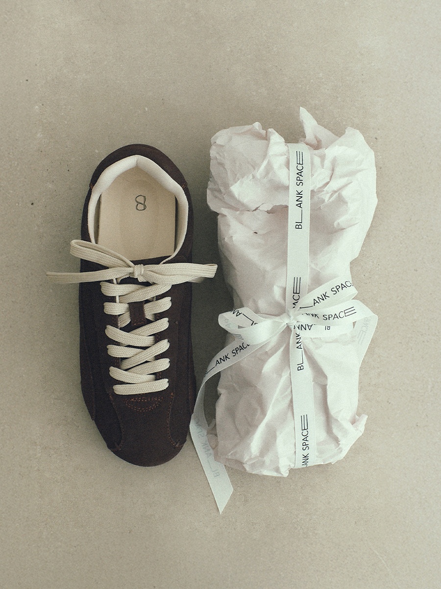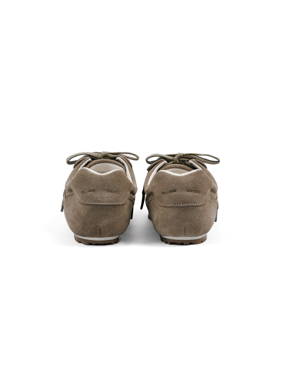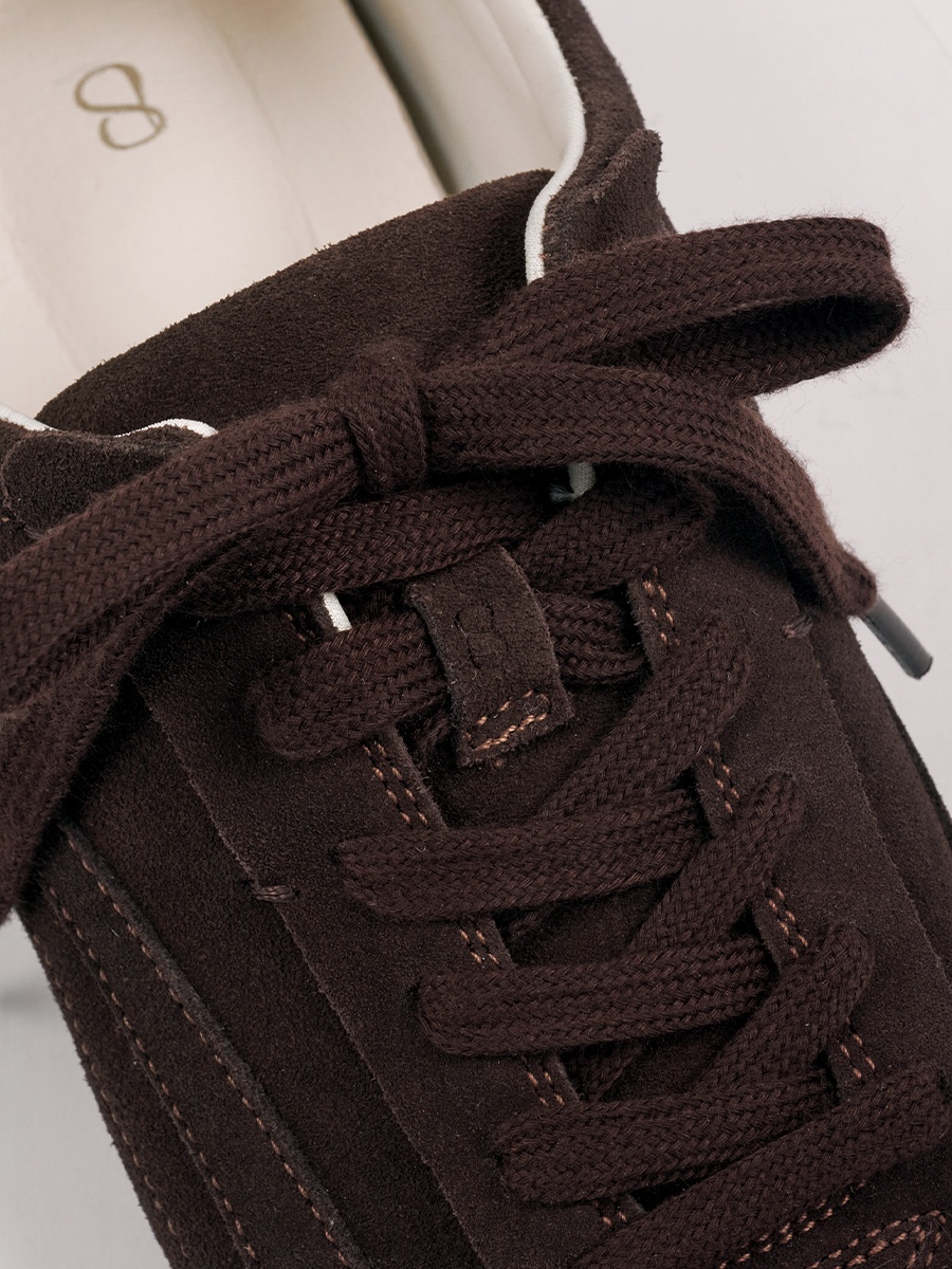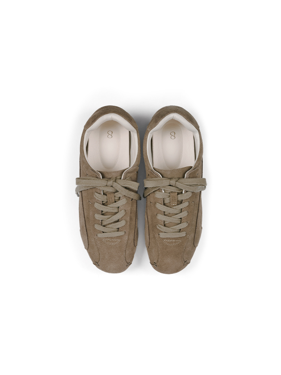 Olga 麂皮德訓鞋 設計靈感源自經典運動鞋型,鞋身搭配綁帶設計,將材質層次運用比擬為提拉米蘇的堆疊美學,兼顧視覺層次與穿著感受,演擇復古與休間並存的氛圍。