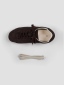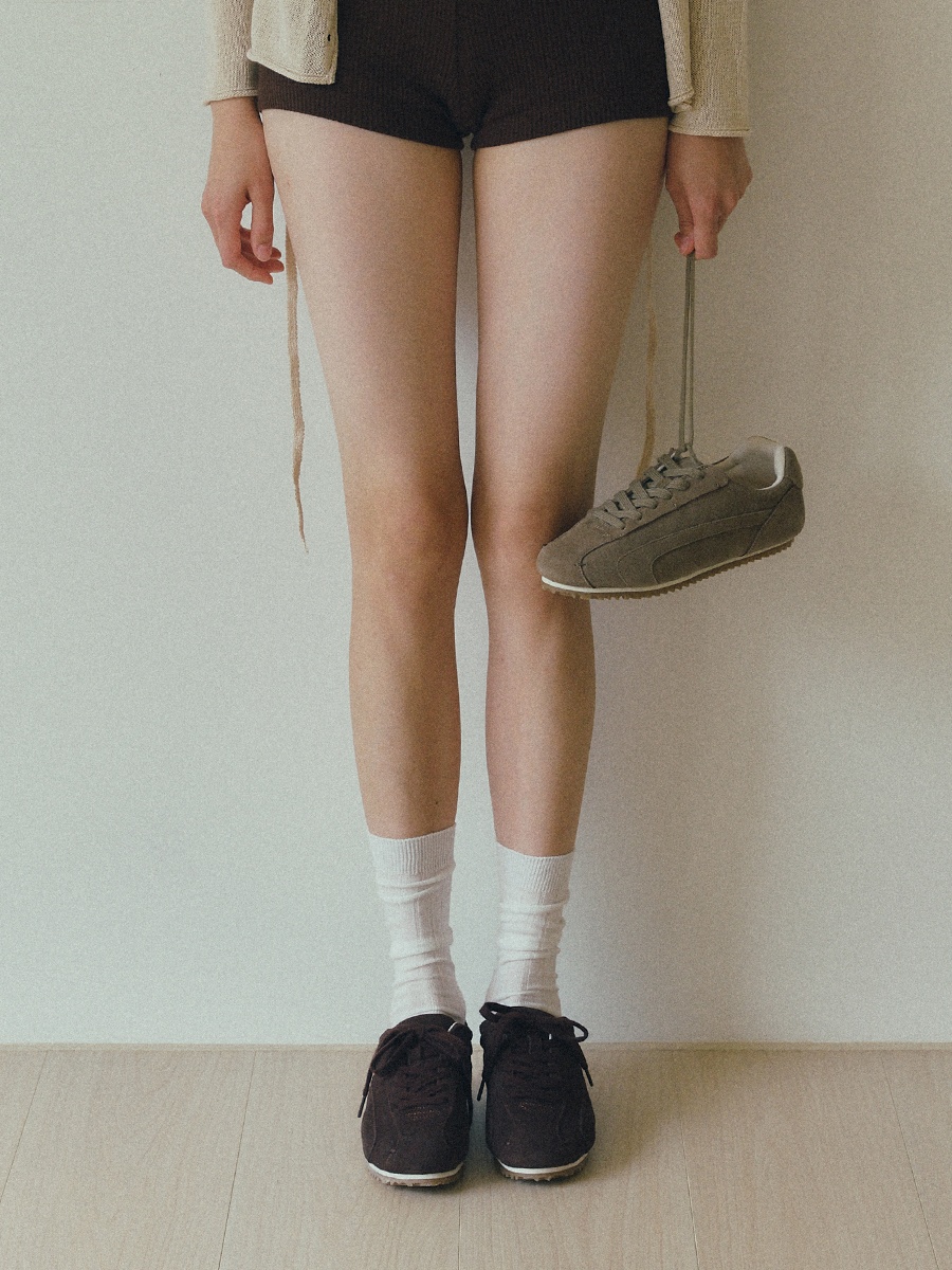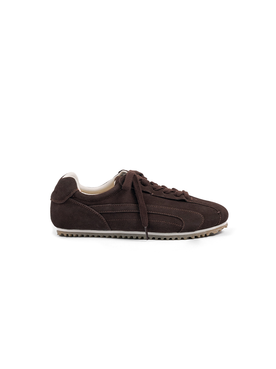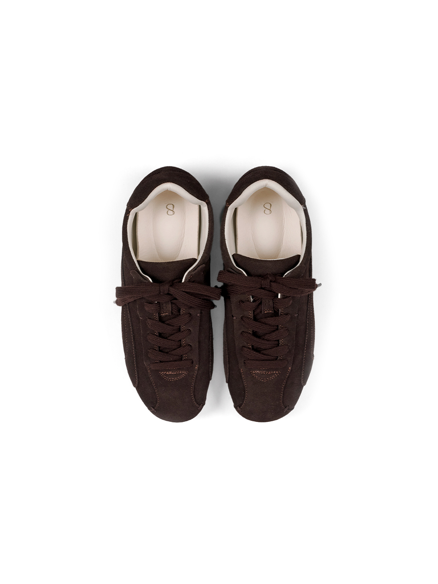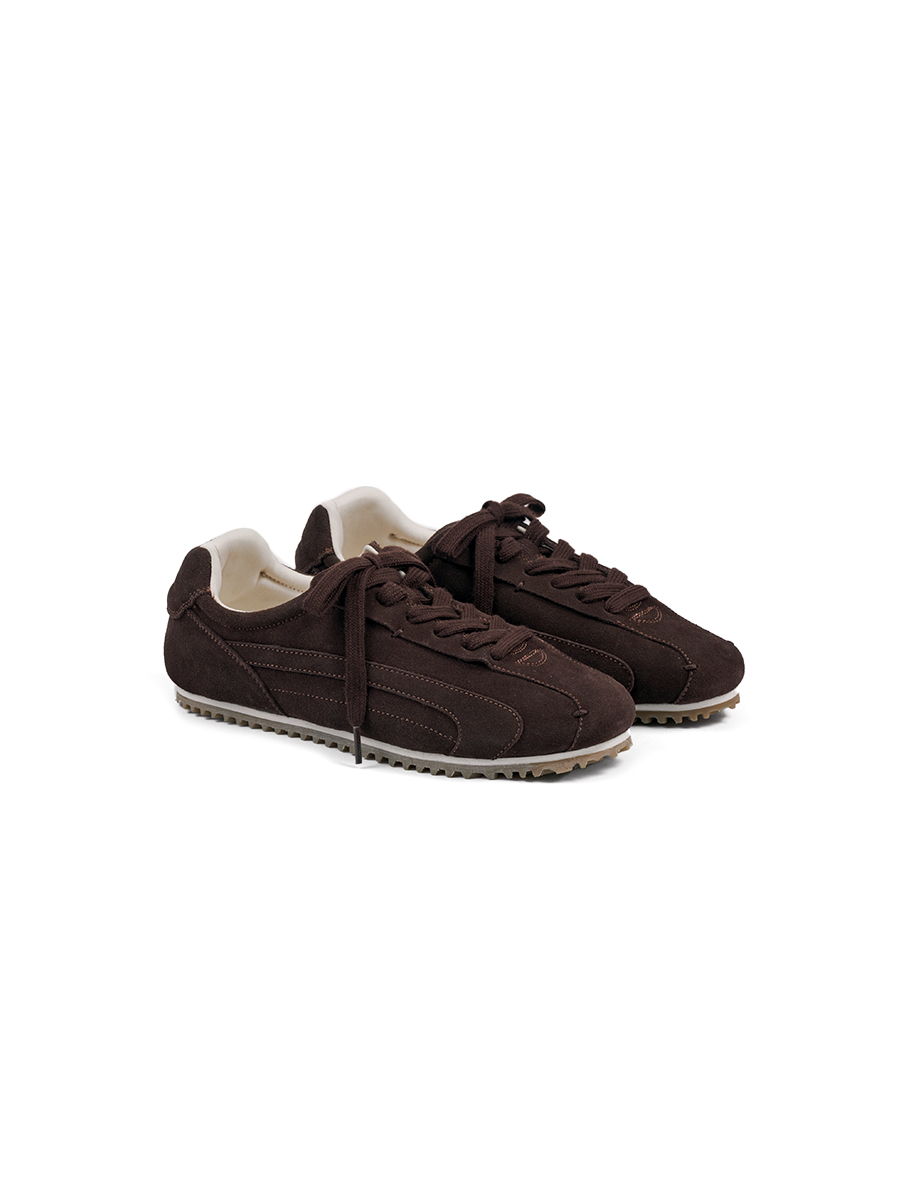 Olga 麂皮德訓鞋 設計靈感源自經典運動鞋型,鞋身搭配綁帶設計,將材質層次運用比擬為提拉米蘇的堆疊美學,兼顧視覺層次與穿著感受,演擇復古與休間並存的氛圍。