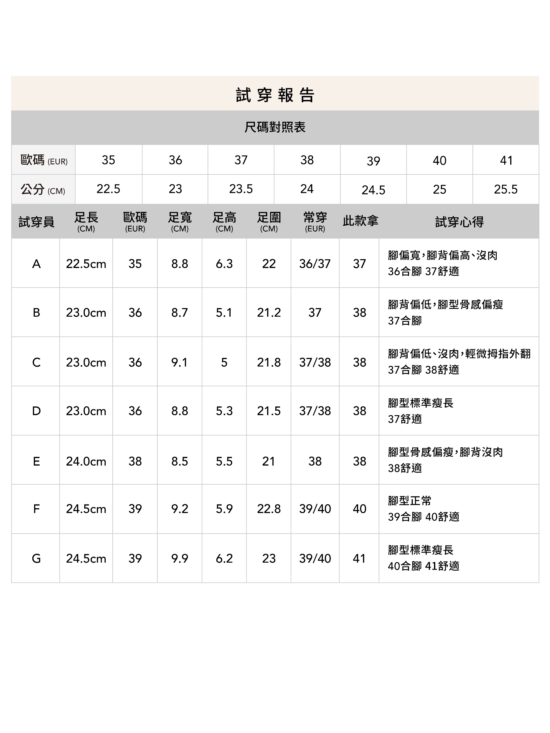 尺寸資訊:36 / 37 / 38 / 39 / 40 / 41鞋跟高度:1cm鞋面主材:牛反絨皮(麂皮)內裡材質:太空棉 (92%polyester + 8%Spandex) 鞋墊材質:豬皮+乳膠鞋底材質:EVA+橡膠調節方式:綁帶式