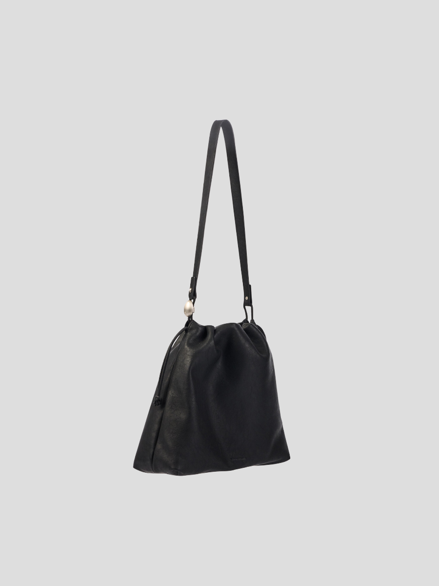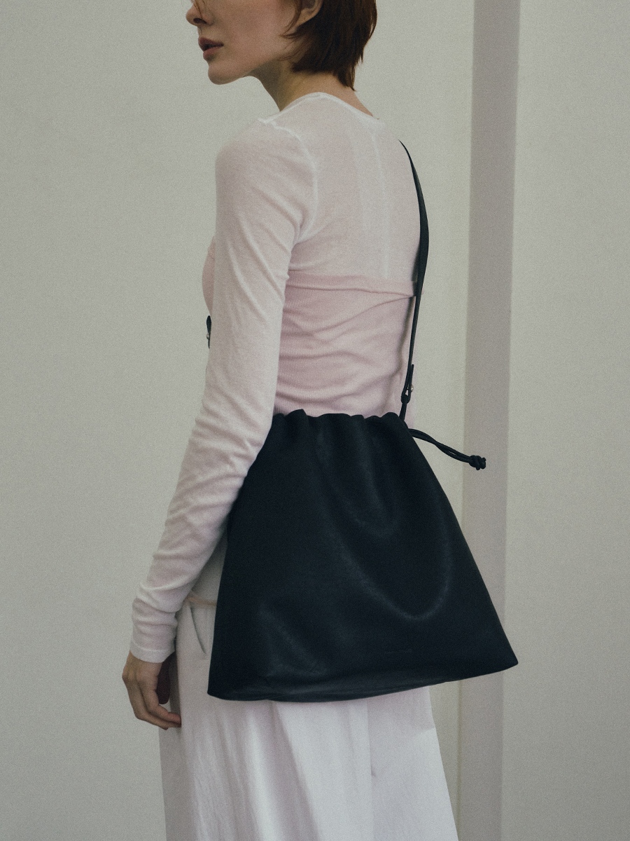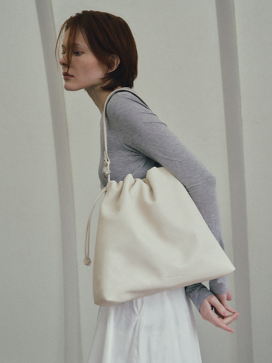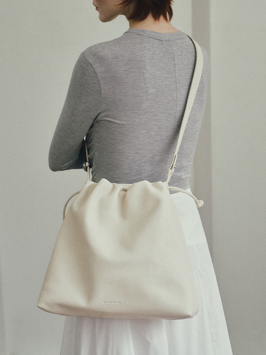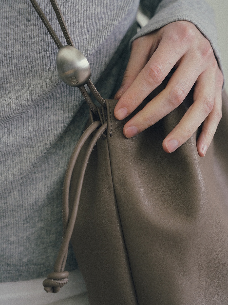 Note3 雲朵束口兩用包 以皮革自然垂墜與大面積摺線為起點,展現沉著而穩定的立體張力。外型以雲朵般柔軟的包身輪廓為核心,透過束繩抽拉設計,形成可塑型的袋口線條。澎鬆造型隨抽拉幅度變化,在圓潤蓬鬆與俐落內收之間轉換,呈現輕盈而自在的包型比例。包身隨步伐微幅起伏,在柔和視覺中維持穩定表現;袋口以束繩作為結構核心,可依使用情境調整開口比例,同時延伸為背帶調節設計,將造型與日常需求自然結合。