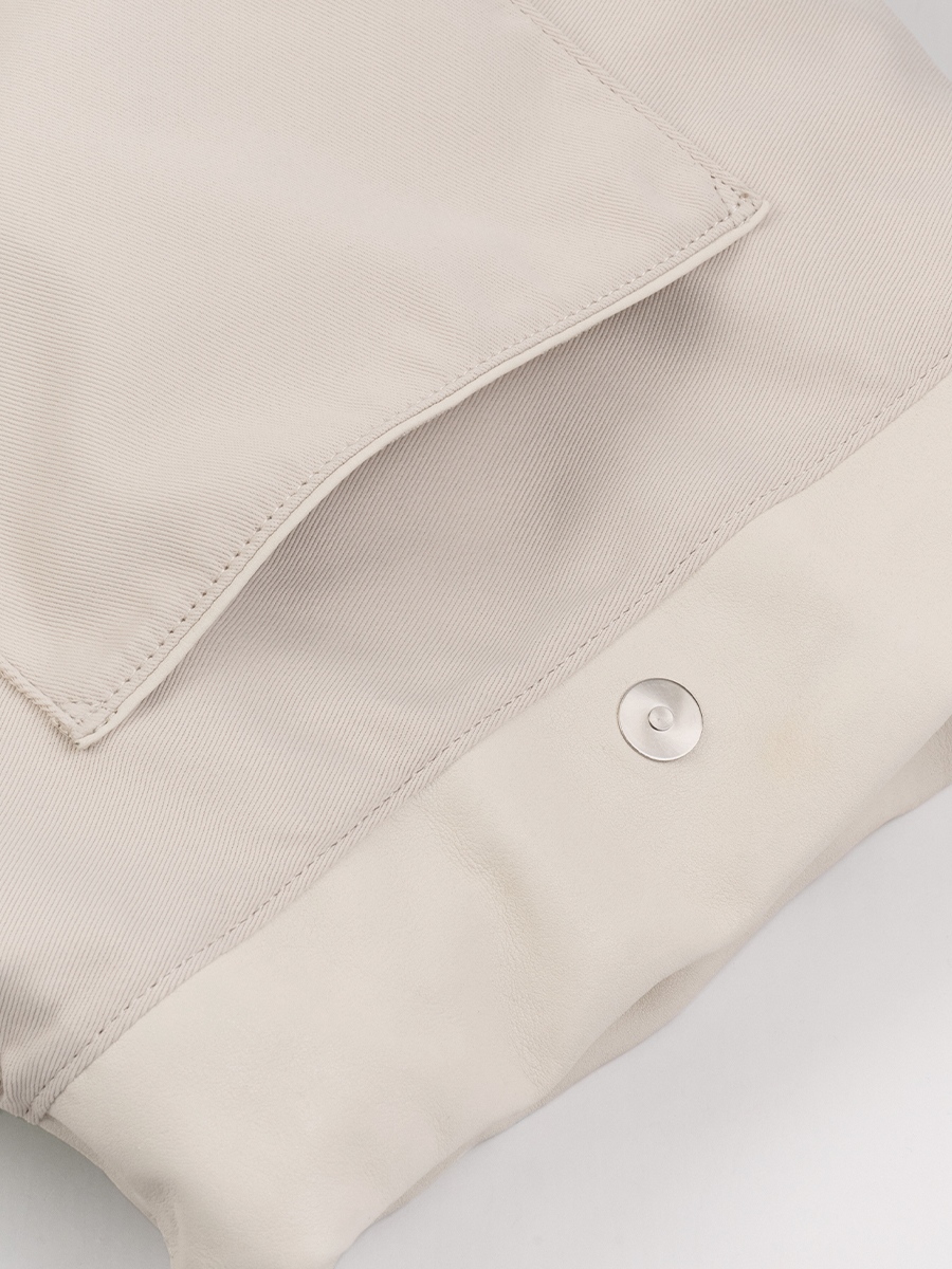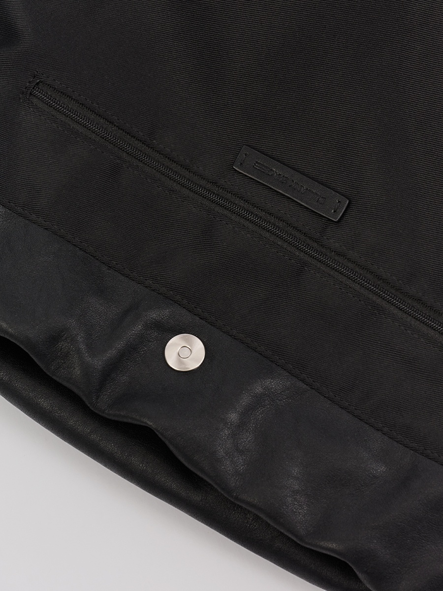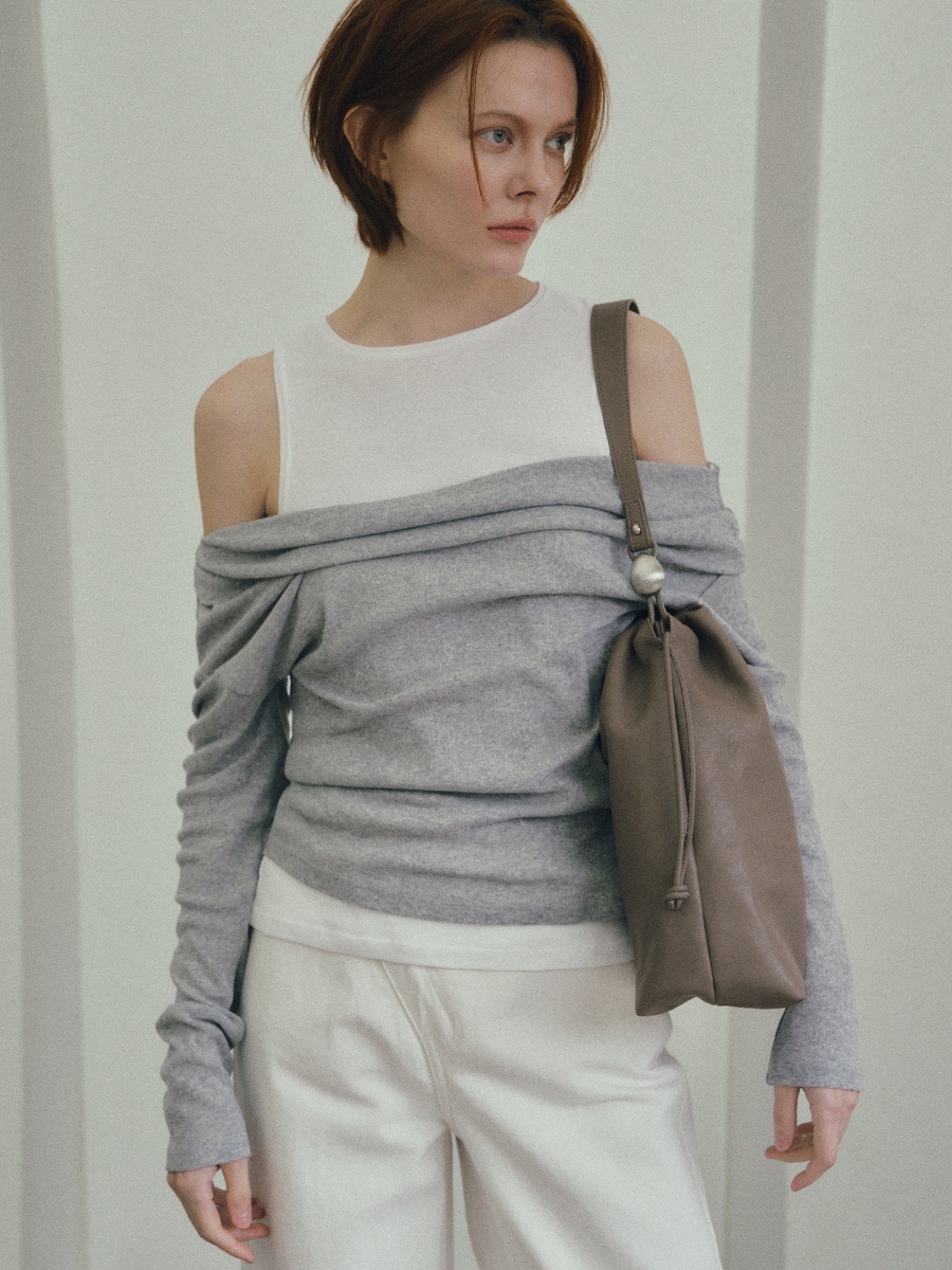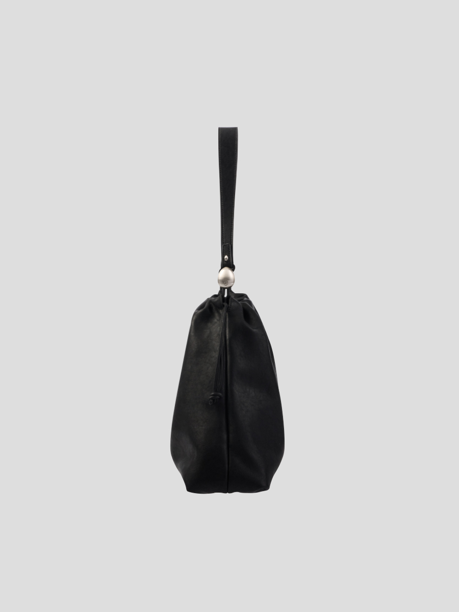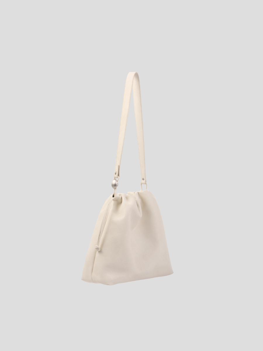 Note3 雲朵束口兩用包 以皮革自然垂墜與大面積摺線為起點,展現沉著而穩定的立體張力。外型以雲朵般柔軟的包身輪廓為核心,透過束繩抽拉設計,形成可塑型的袋口線條。澎鬆造型隨抽拉幅度變化,在圓潤蓬鬆與俐落內收之間轉換,呈現輕盈而自在的包型比例。包身隨步伐微幅起伏,在柔和視覺中維持穩定表現;袋口以束繩作為結構核心,可依使用情境調整開口比例,同時延伸為背帶調節設計,將造型與日常需求自然結合。