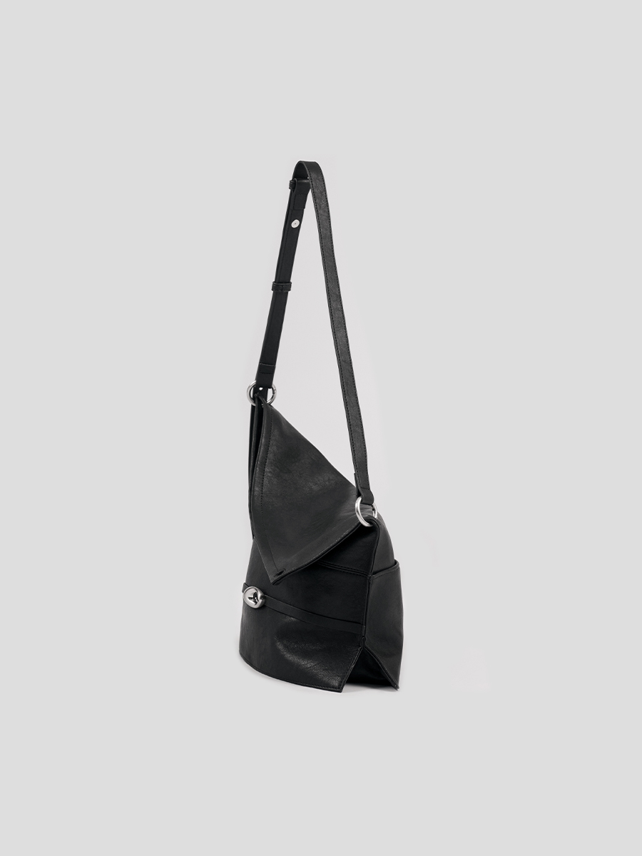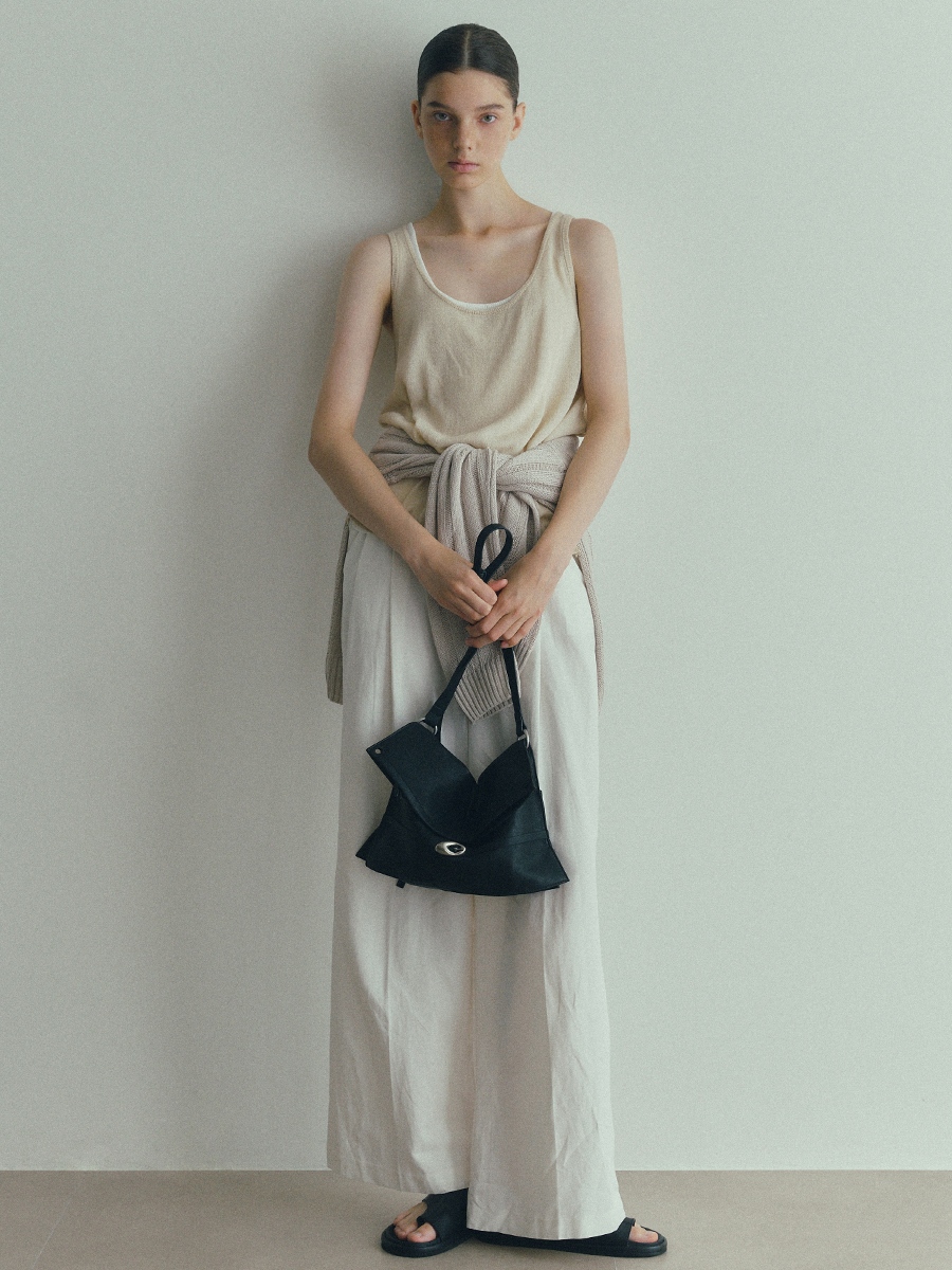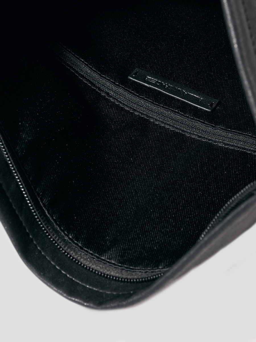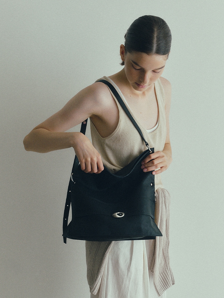 包身設有四個孔位,可與揹帶隨意組合,變換不同的廓型;兩側開衩結構則能延展底部,亦能提升內裏容量,在造型與實用之間取得平衡。