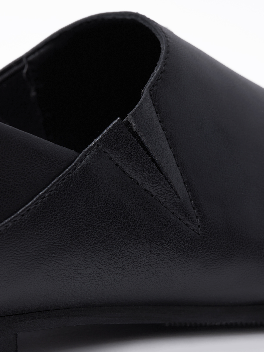 從圓潤翹頭到深 V 剪裁,不僅修飾腿部比例,米白色手縫線落在極簡輪廓上,為整體增添細膩手工溫度。