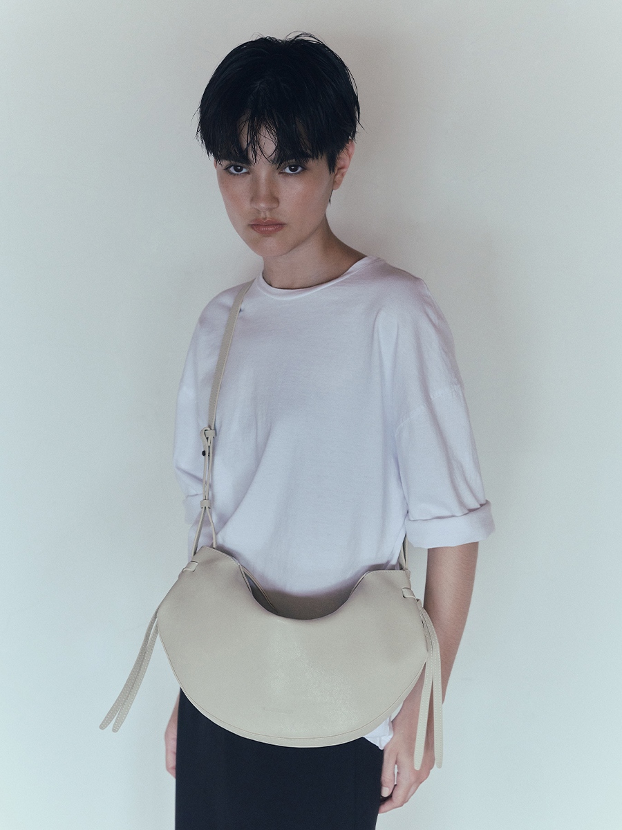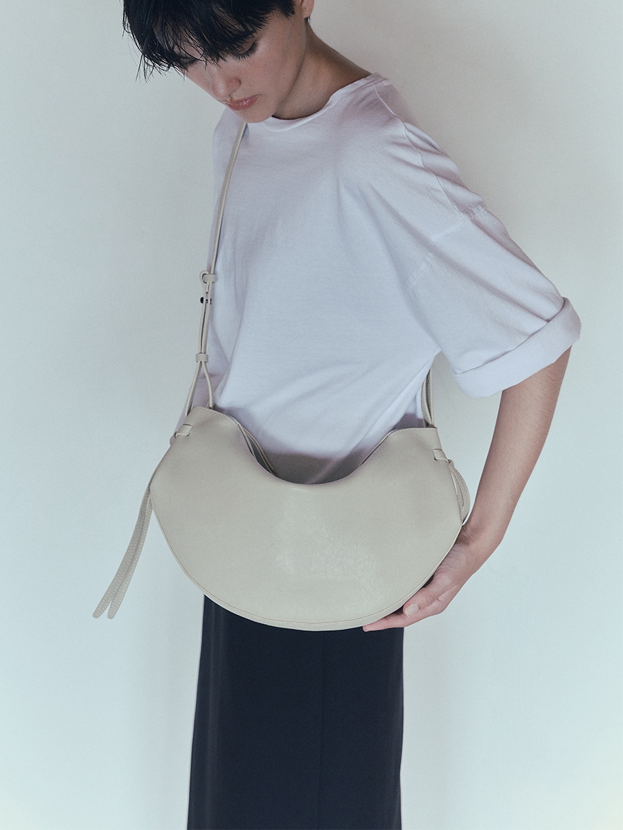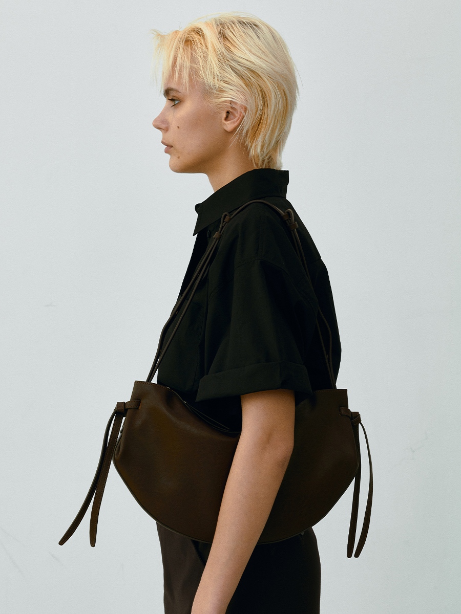 此款 Dudo真皮綁結彎月包 選用肌理皮面為整體增添了一份自然純樸氣息,包款展示了層疊藝術,以簡約流暢的包身線條,搭配兩側穿插袢帶使整體形成貫穿的設計細節,在簡約流暢的同時增添層疊空間感,份量剛好的弧形使裝帶物品時能有更佳的自然下墜弧形。