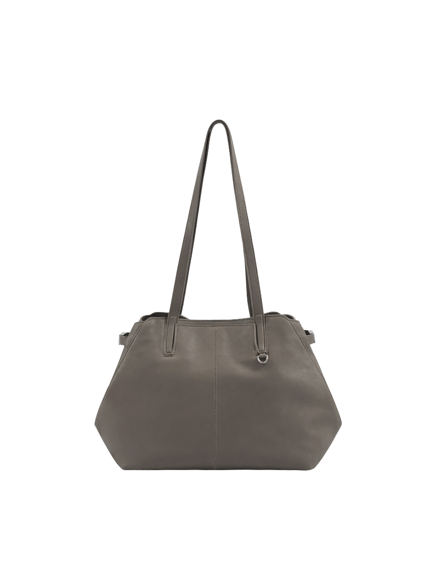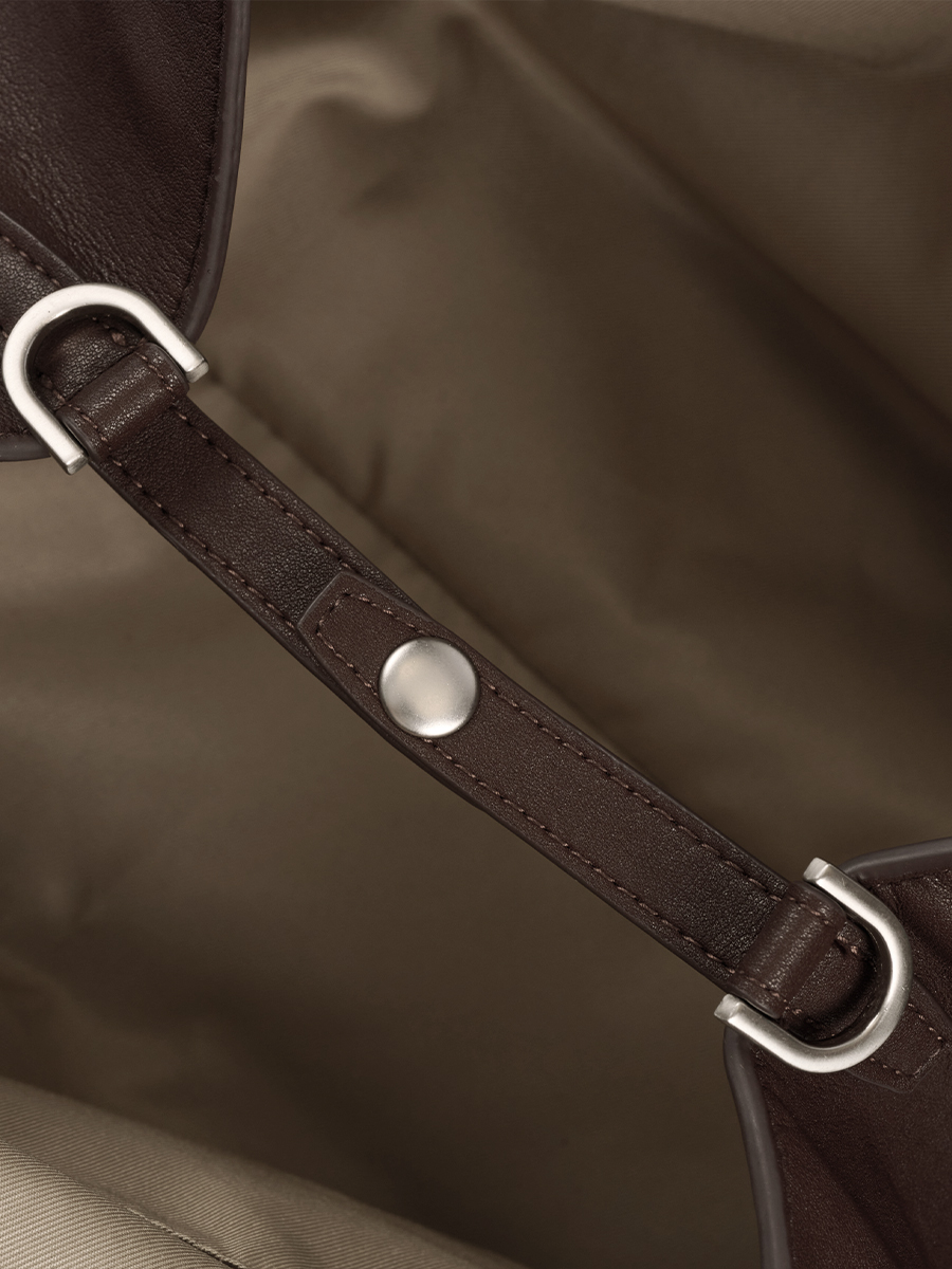 兩側俐落的剪接線條在收放之間展現層次感,勾勒出柔中帶剛的立體輪廓;側邊搭配品牌訂製插銷結構釦,讓包型變化更靈活、造型更穩固。
