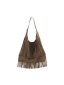 Sue 真皮流蘇托特包 以簡潔大廓形為基礎,勾勒俐落結構線條,結合雙材質雙面設計,一包即可呈現兩種風格,靈活切換,滿足多樣化的日常需求。正面選用磨砂麂皮,搭配大面積流蘇細節,隨步伐搖曳,增添層次與律動感。反面則以手感柔韌細膩的超纖皮革呈現俐落大方的輪廓,無論正式場合或休閒穿搭都能輕鬆駕馭。揹帶採用寬至窄的漸變線條設計,展現俐落感並提升高級氛圍;大容量空間兼具舒適與實用性。