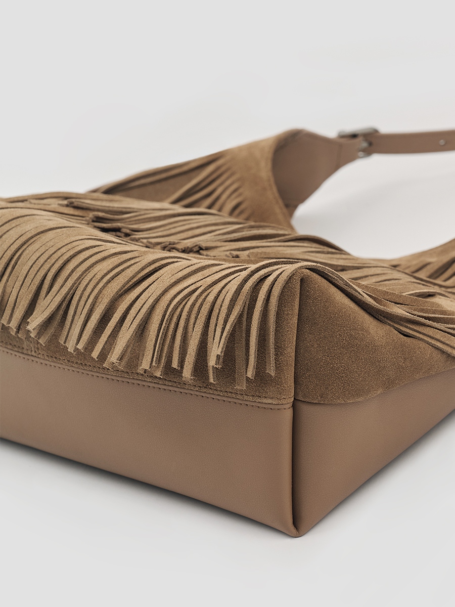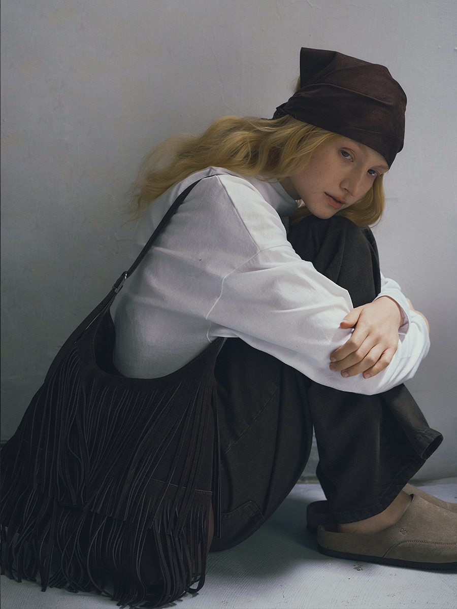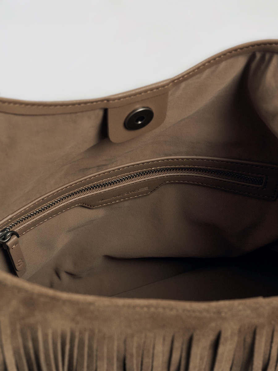 Sue 真皮流蘇托特包 以簡潔大廓形為基礎,勾勒俐落結構線條,結合雙材質雙面設計,一包即可呈現兩種風格,靈活切換,滿足多樣化的日常需求。正面選用磨砂麂皮,搭配大面積流蘇細節,隨步伐搖曳,增添層次與律動感。反面則以手感柔韌細膩的超纖皮革呈現俐落大方的輪廓,無論正式場合或休閒穿搭都能輕鬆駕馭。揹帶採用寬至窄的漸變線條設計,展現俐落感並提升高級氛圍;大容量空間兼具舒適與實用性。